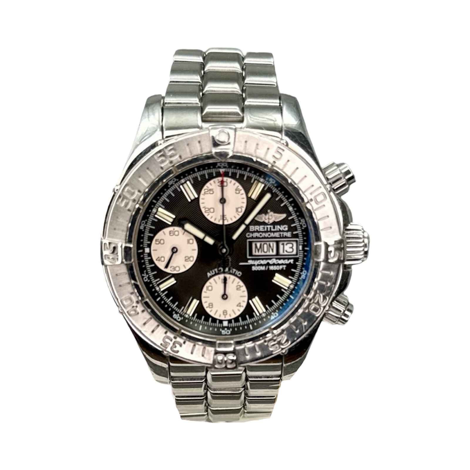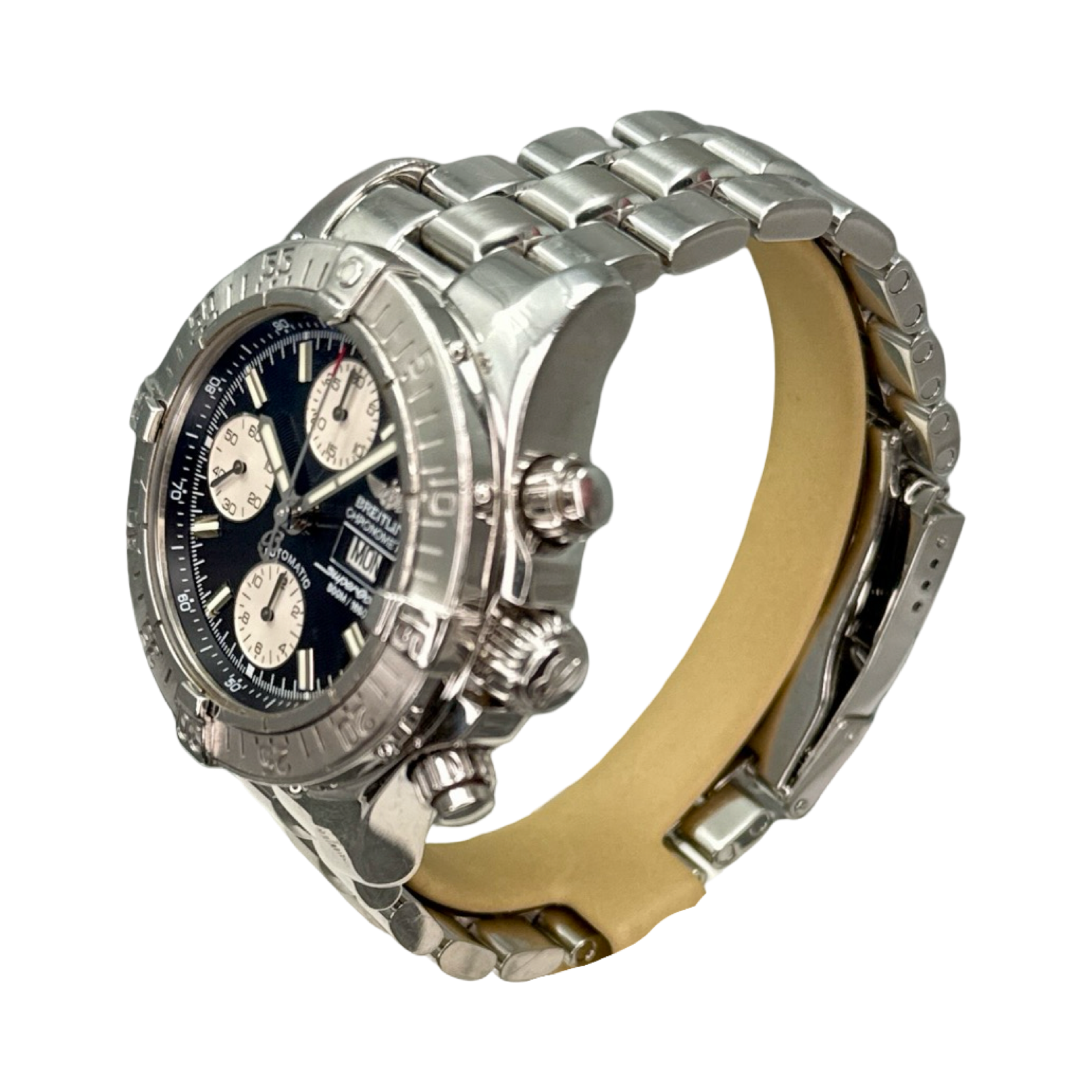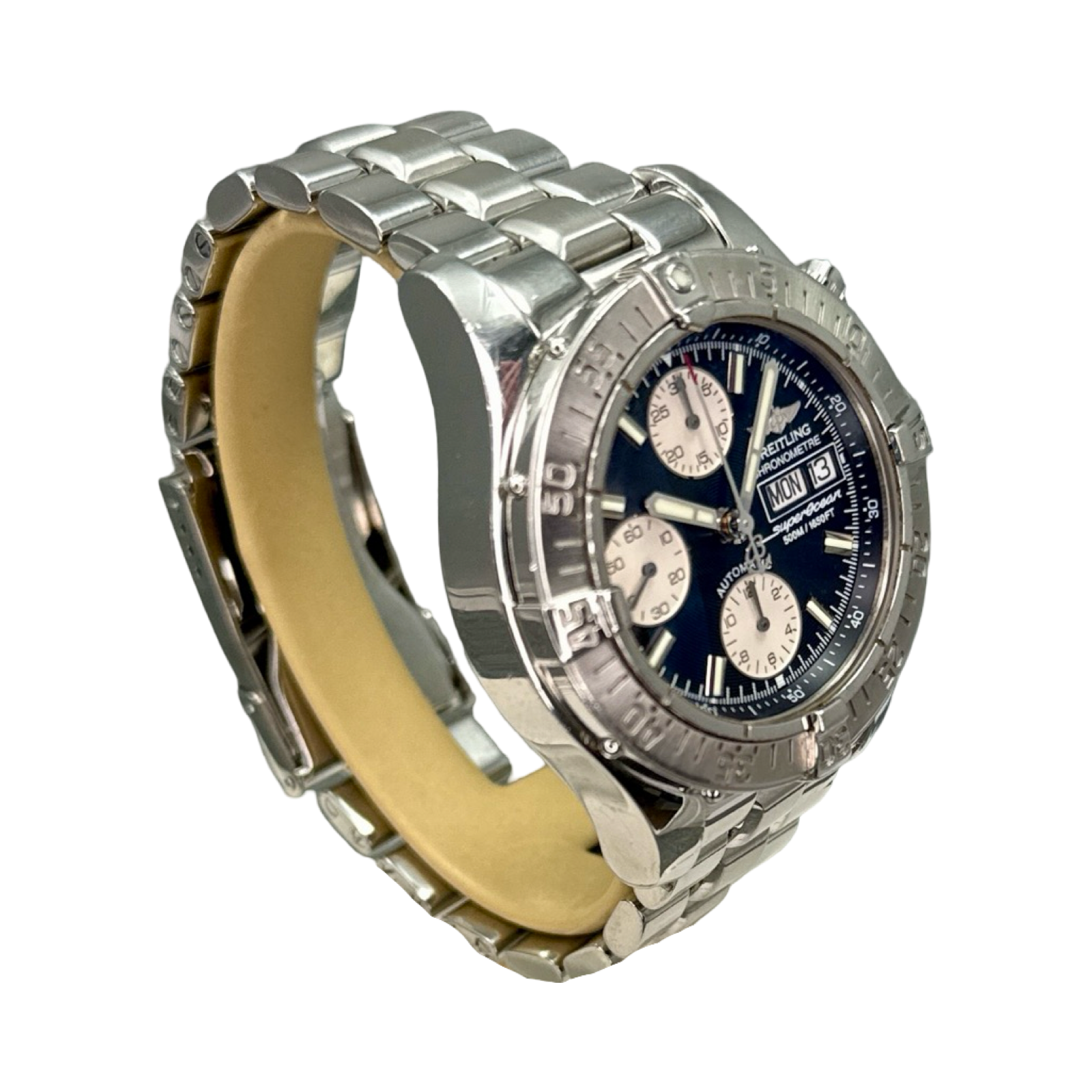 Wearing boldly on the wrist at 42mm by 15mm, the SuperOcean's 500m water resistant case is a true sports-ready wearer with its screw-down crown and chronograph pushers alongside its rider-tab adorned, uni-directional bezel. On the dial, the rugged style of the chronograph continues, with large applied furnishings, smart uses of lume throughout, and an appealing use of contrast and texturing most obvious in its sub-dials