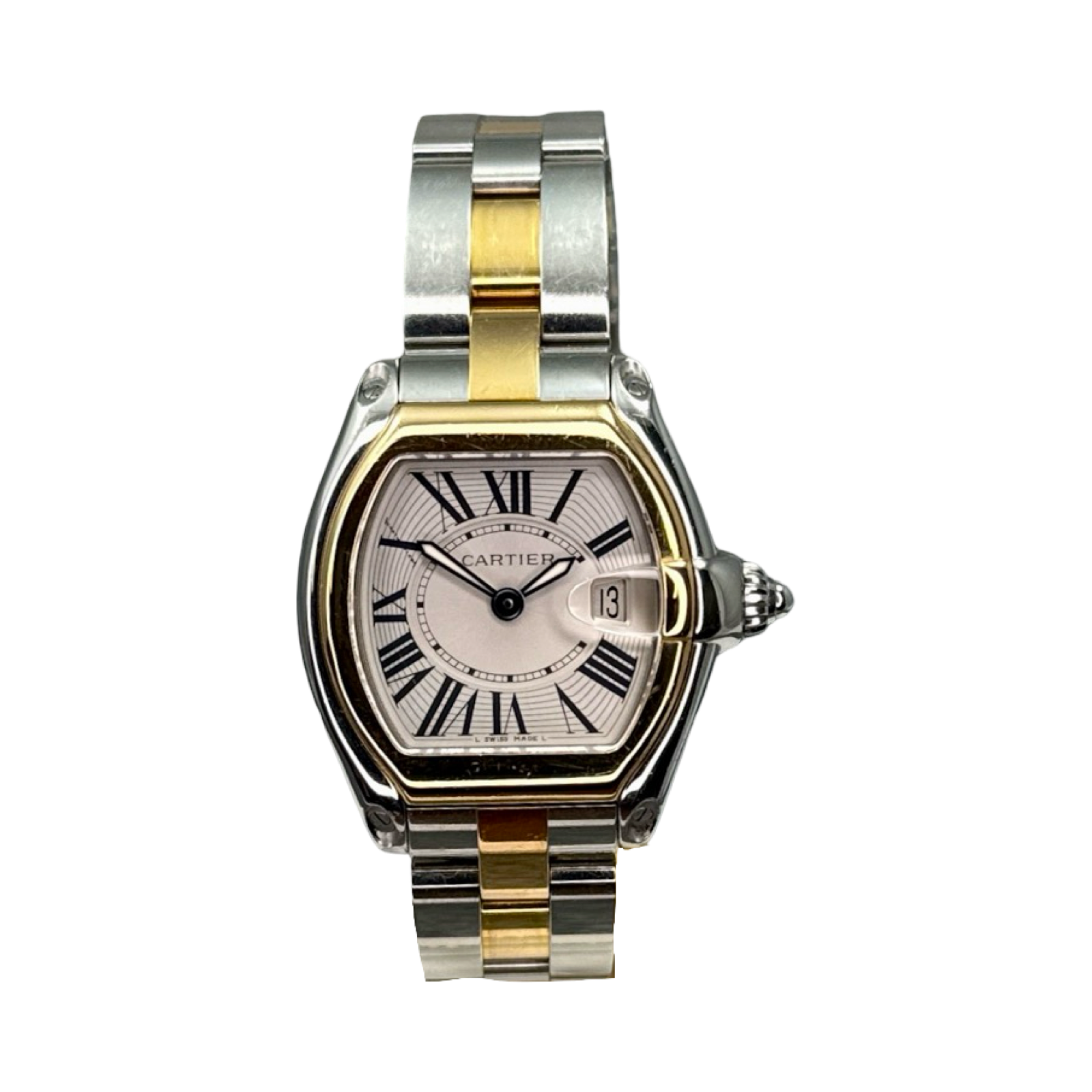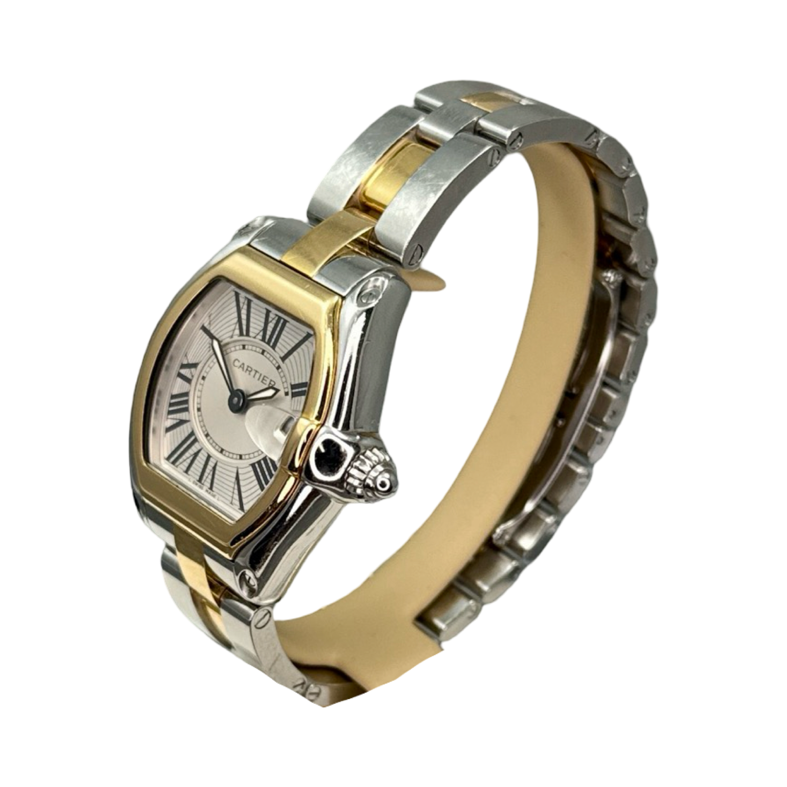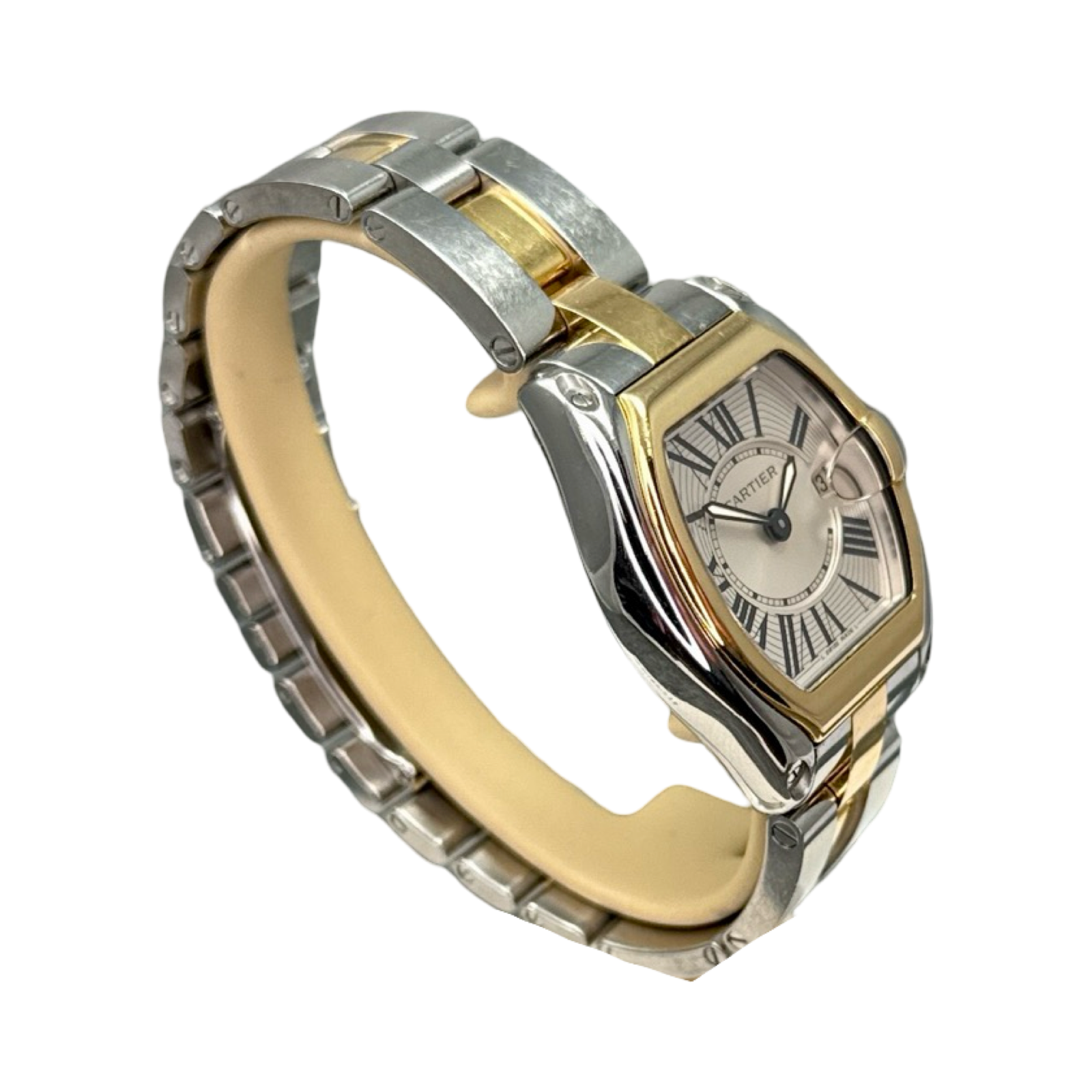 This pre-owned Roadster is crafted from stainless steel + 18kt Yellow Gold with a silver dial featuring arabic markers. Replete with a stainless steel + 18K bracelet, it is an exceptional choice for any collection. A watch of ambitious modernity, the Cartier Roadster was inspired by the Porsche Roadster and features design elements such as a date window resembling a car windshield, lugs crafted to look like design headlights and a distinctive crown reminiscent of vintage wheels.
