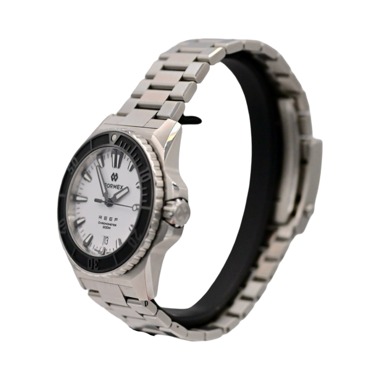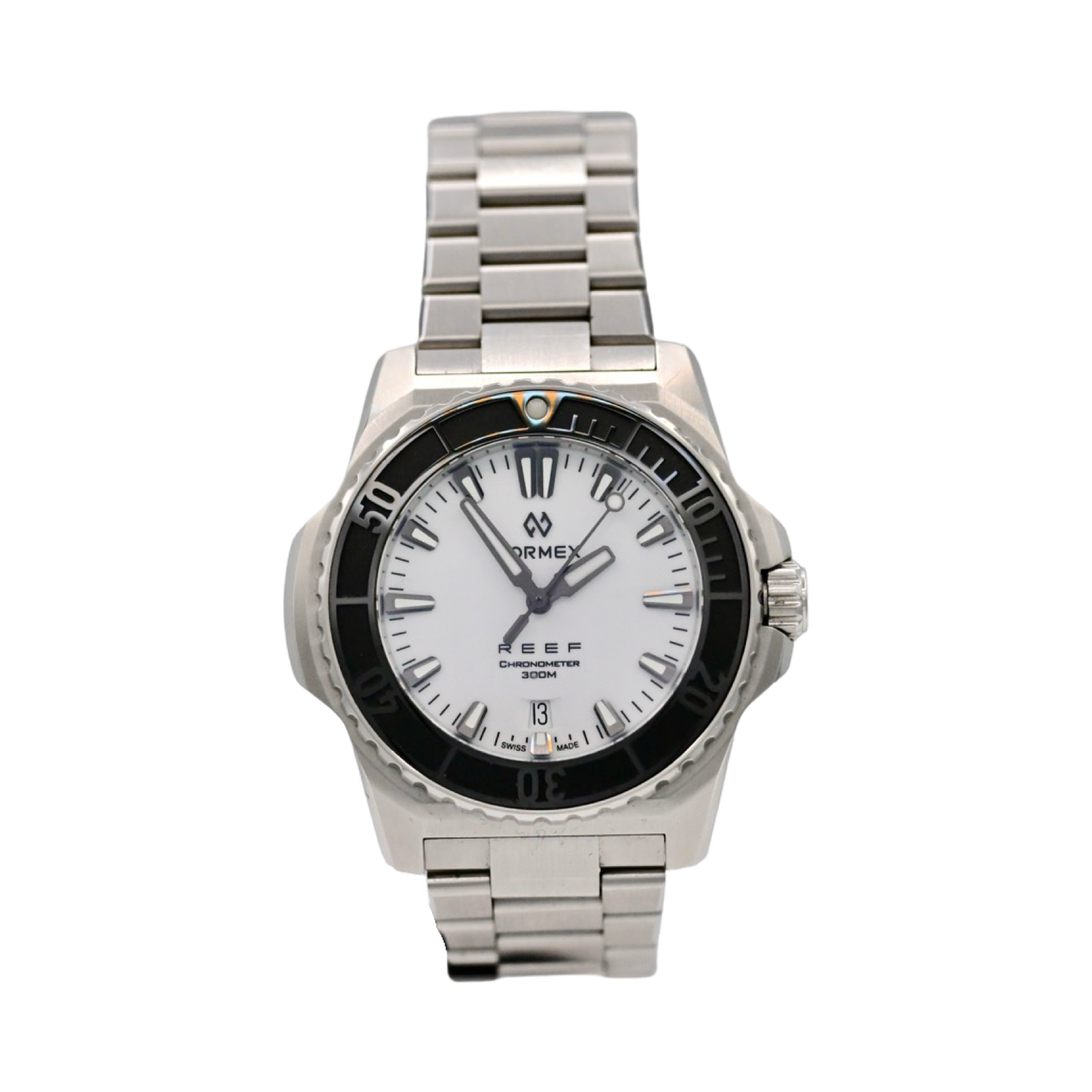 The 39.5mm stainless-steel case with its distinctive shape provides both a functional guard for the screw-down crown and a visual symmetry alike. Originally designed as a 42mm dive watch, the smaller diameter also means a shorter, more wearable lug-to-lug distance of 45.5mm and a height of just 11mm. A double gasket construction is tested for 300 m / 1000 ft of water resistance. Mirror-polished bevels and brushed surfaces throughout the watch case, bracelet and down to the hands and triangle-shaped indices