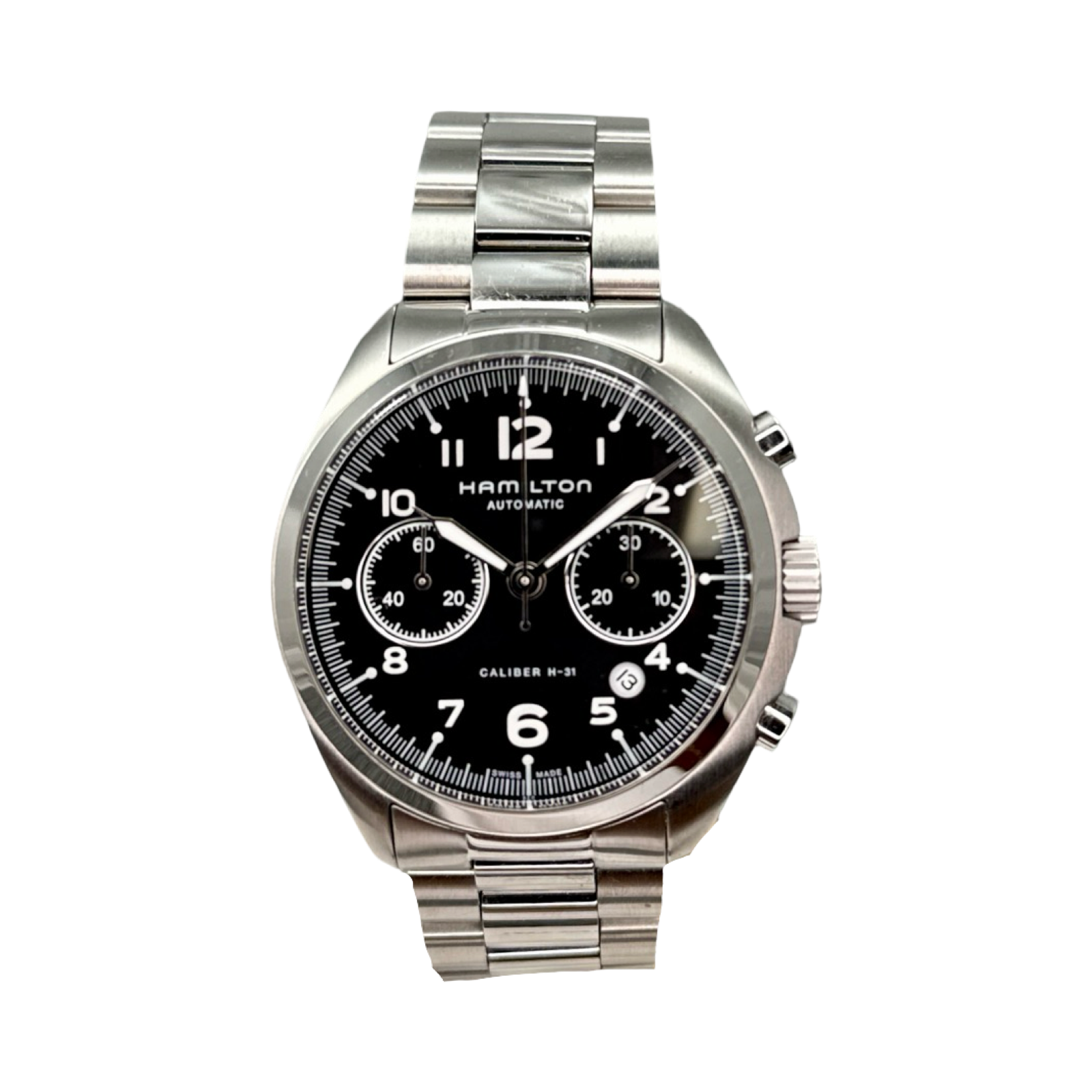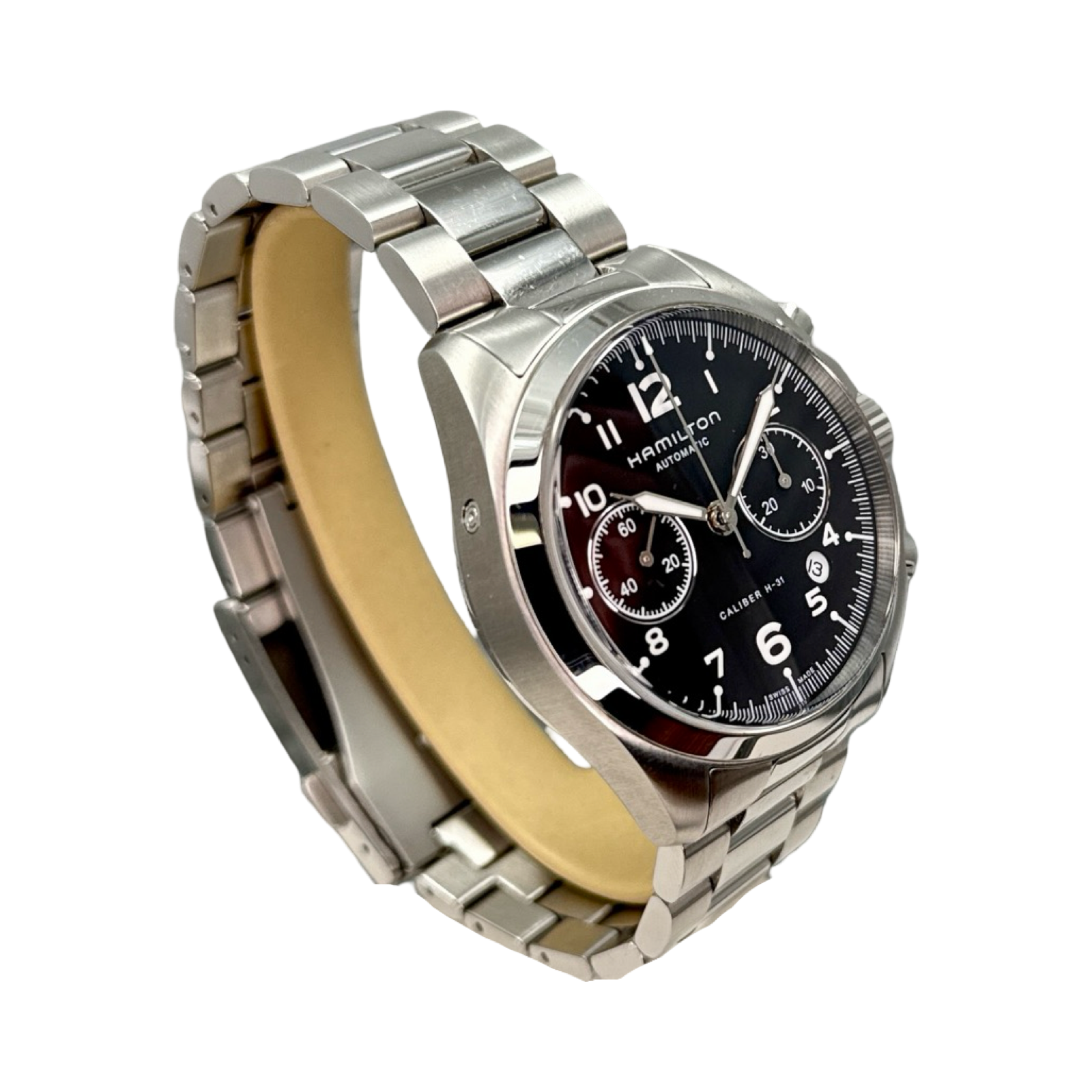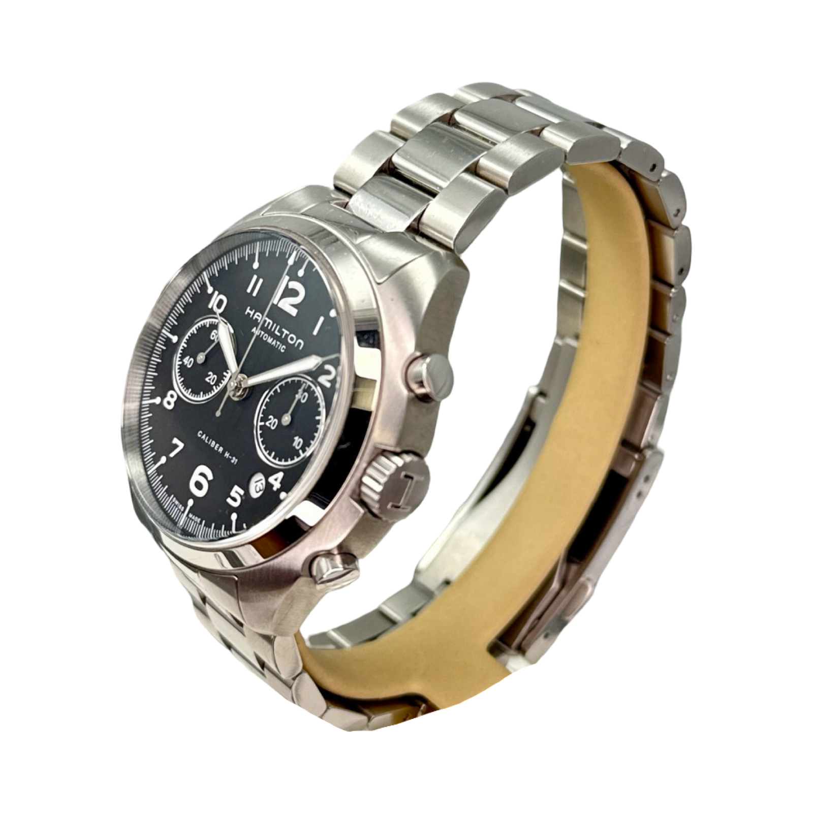 The Hamilton Khaki Field Auto Chrono Watch is a beautiful classic Hamilton automatic men's wristwatch in immaculate condition. The watch sits on the oemHamilton bracelet. Display windowed back shows off the very accurate Valjoux 7750 movement.