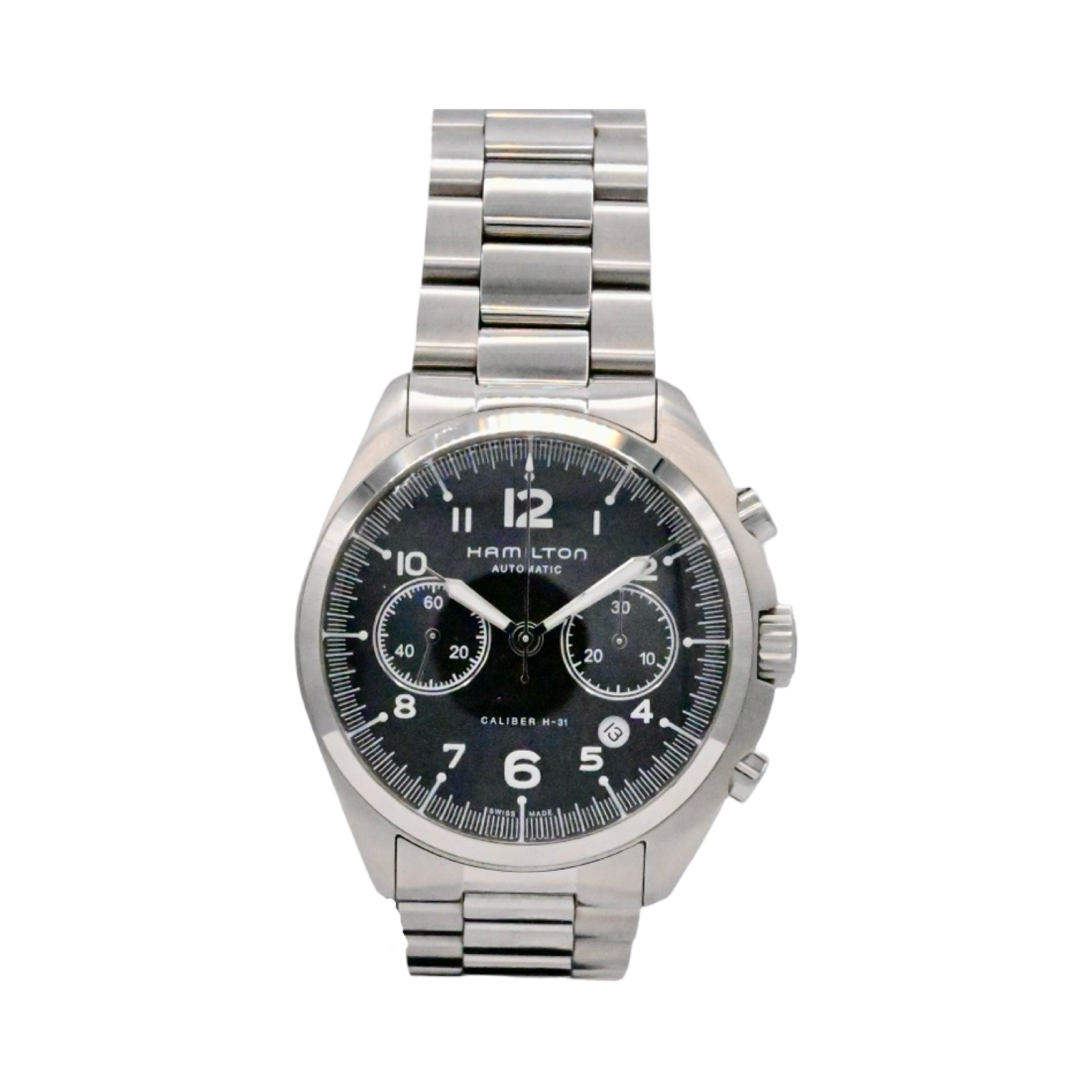 The Hamilton Khaki Field Auto Chrono Watch is a beautiful classic Hamilton automatic men's wristwatch in immaculate condition. The watch sits on the oemHamilton bracelet.  Display windowed back shows off the very accurate Valjoux 7750 movement.