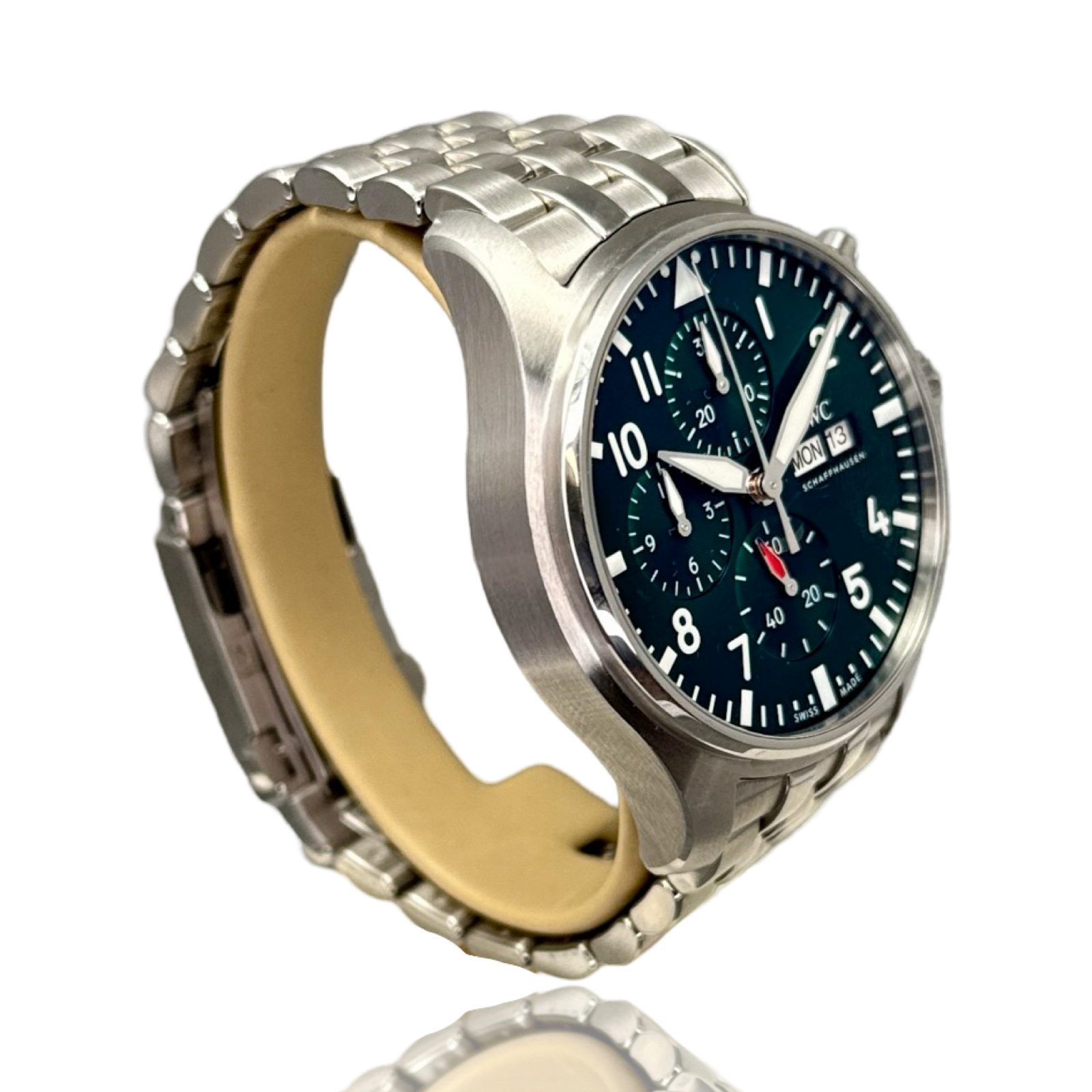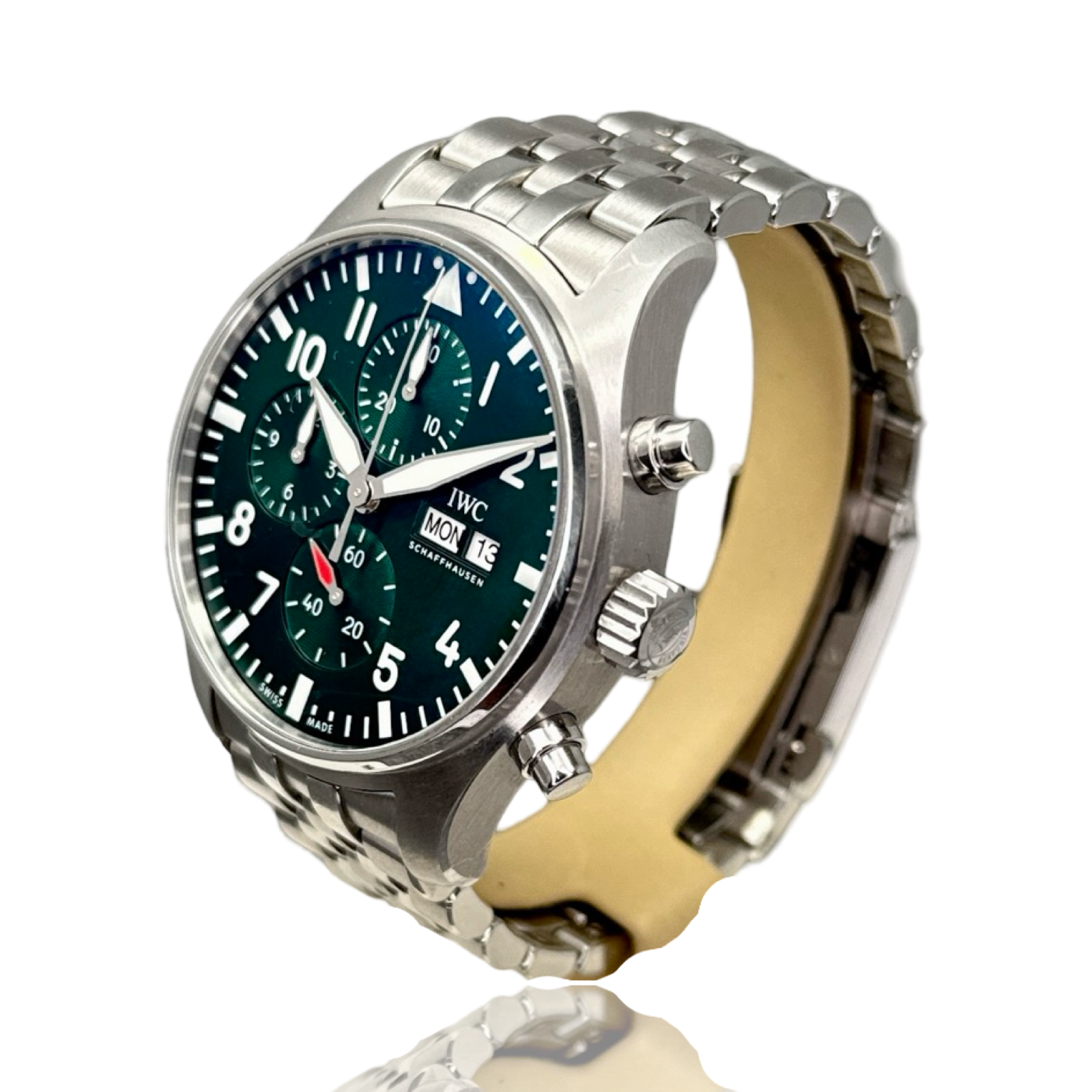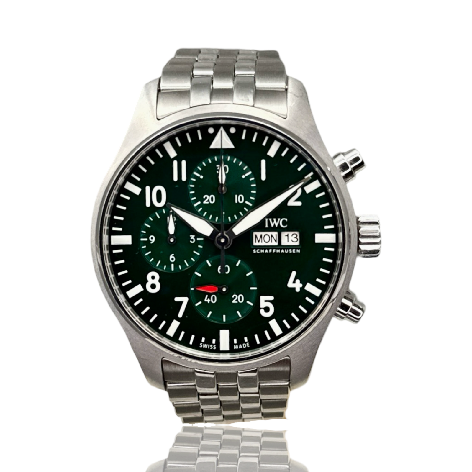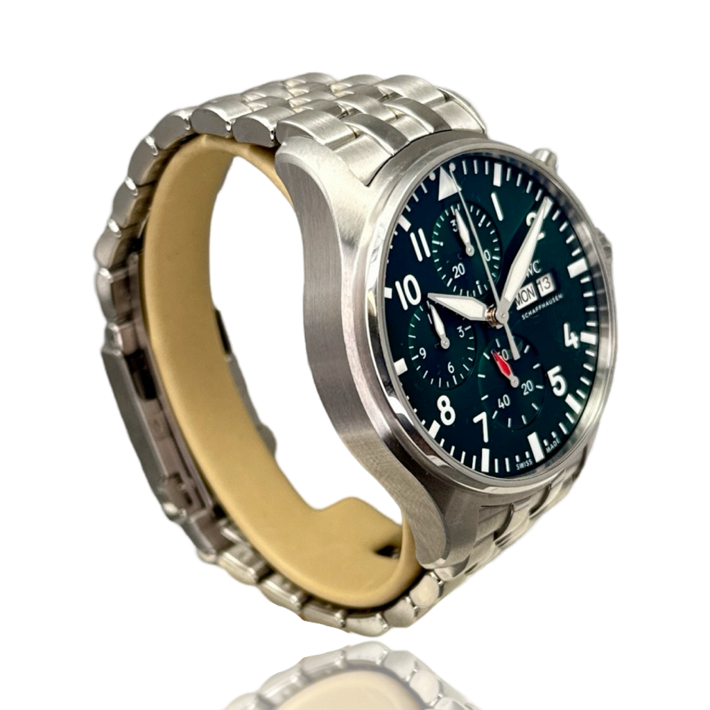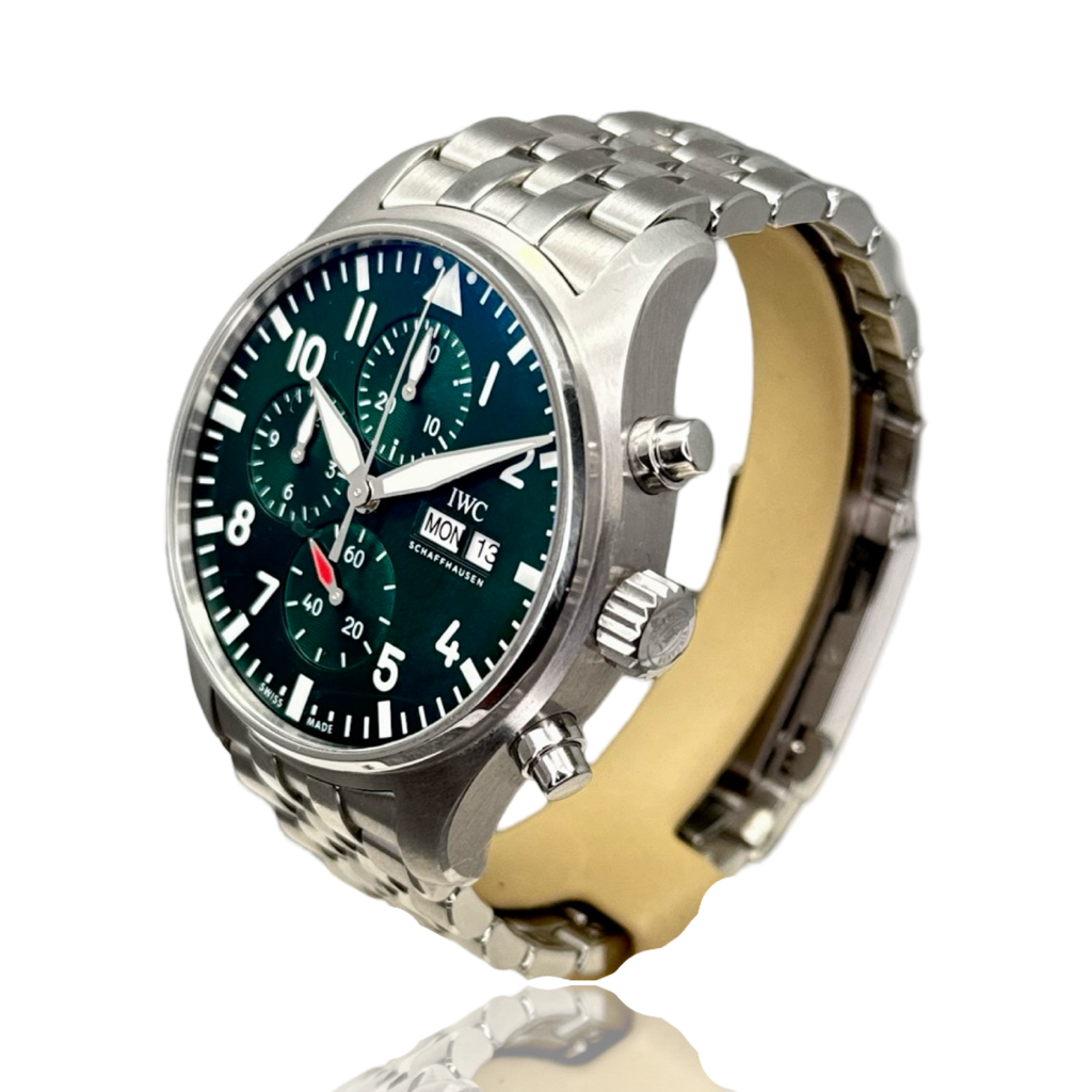 IWC Pilot's Watches Chronograph Racing Green (IW37806) self - winding automatic watch, features a 43mm stainless steel case surrounding a green dial on a Stainless Steel Bracelet. Functions include hours, minutes, small seconds, day, date and chronograph.