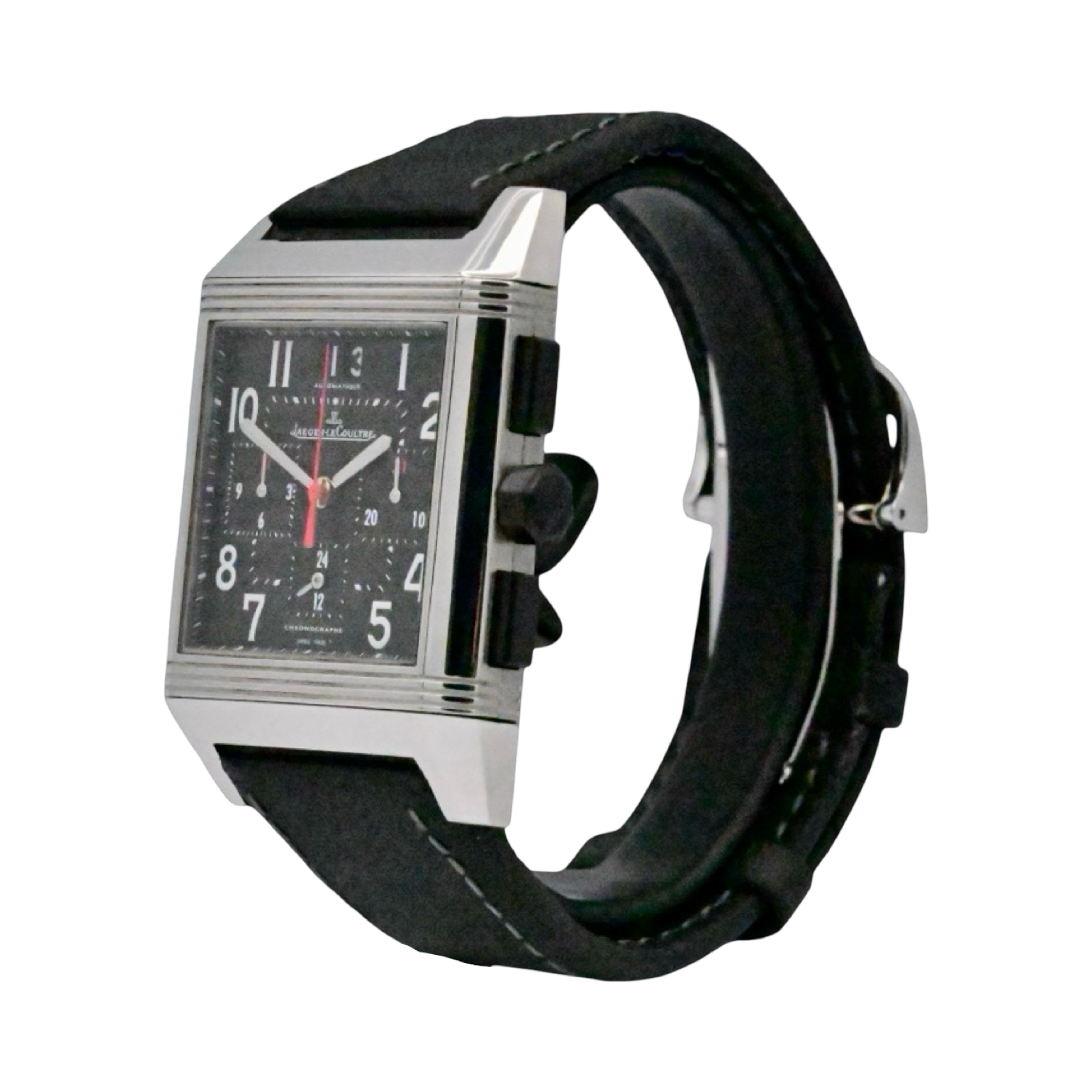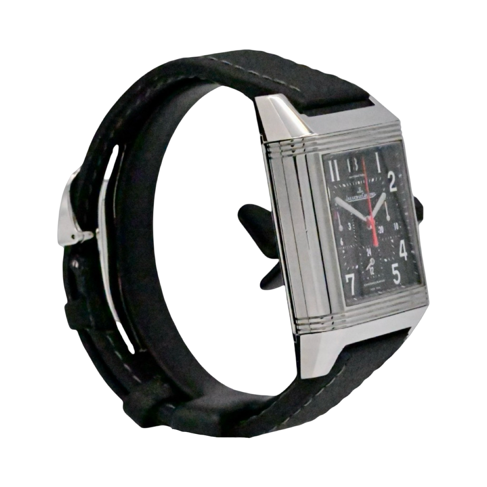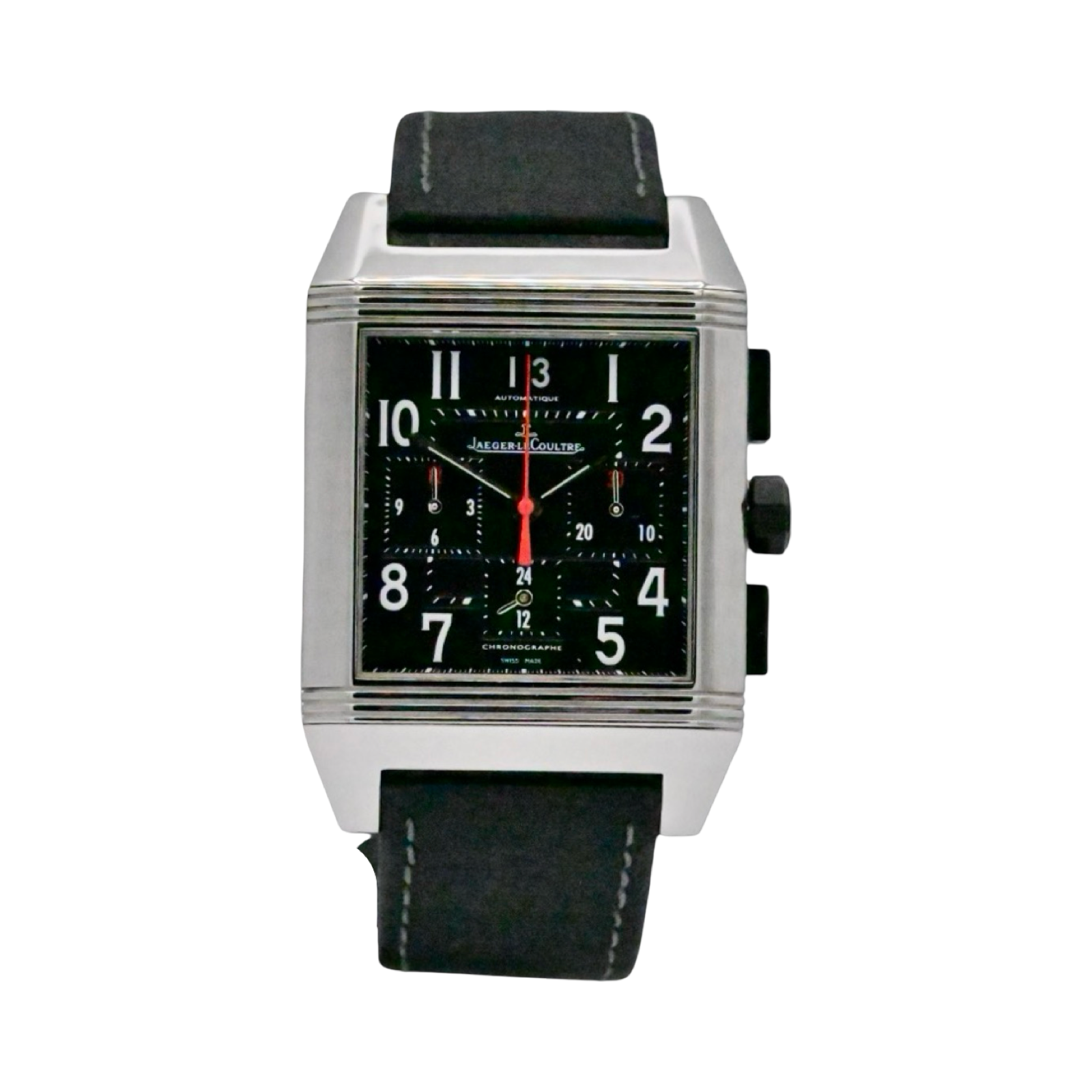 One of the longest production timepieces ever, the Reverso, introduced in 1931. This version displays the beautiful Automatic Movement on the reverse side, offers a chronograph ans large double digit date.