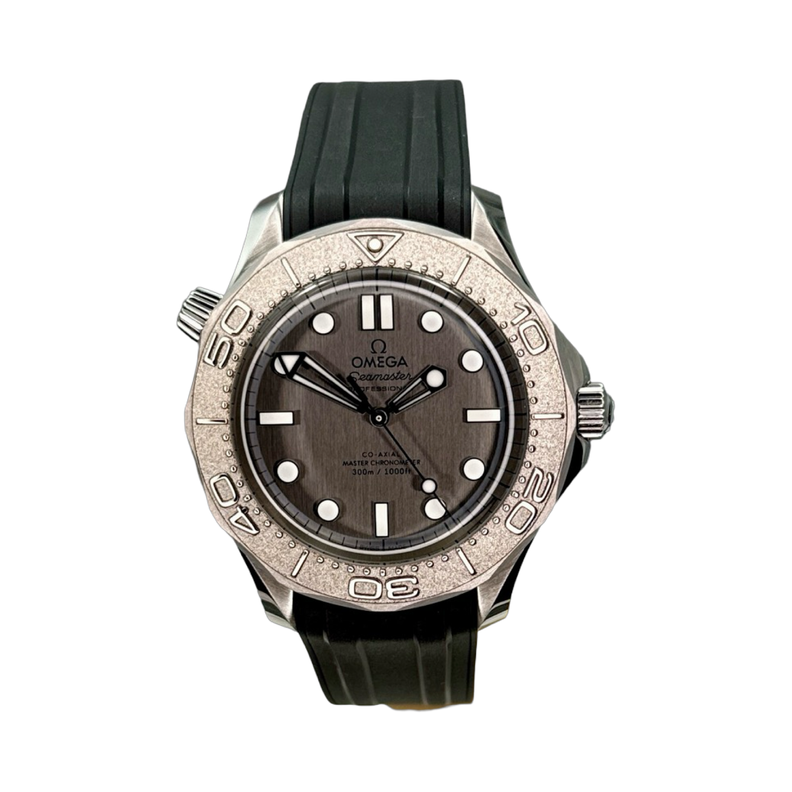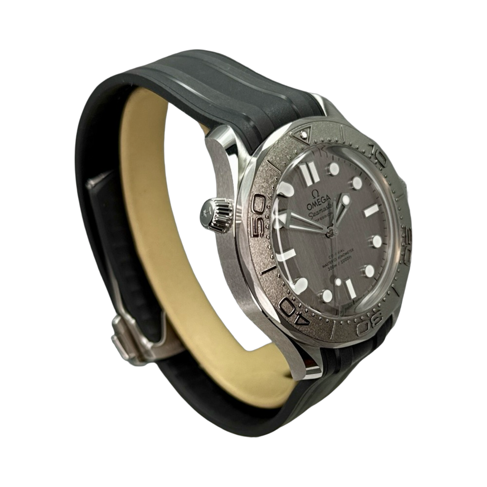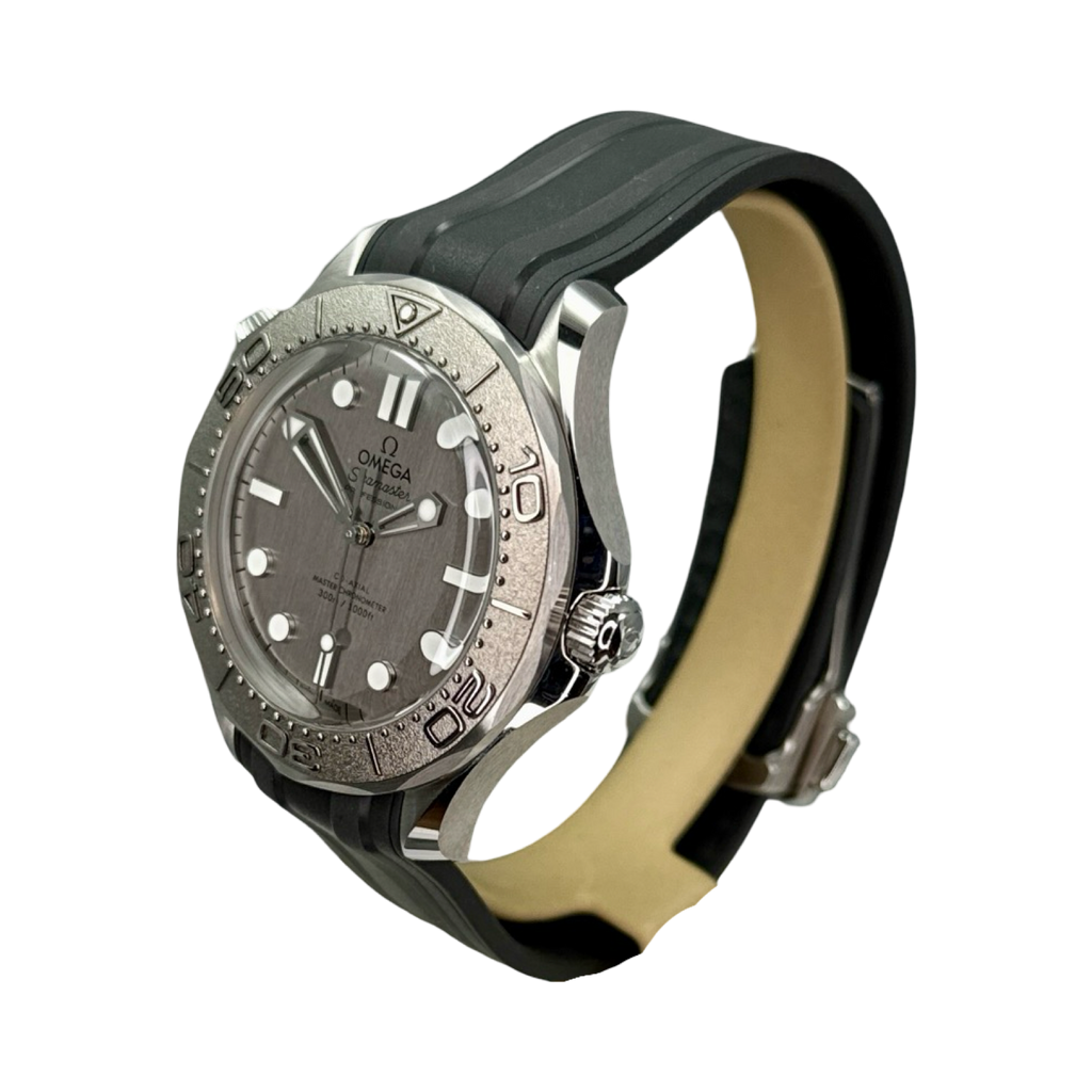 This 42 mm model is crafted in stainless steel and includes a steel bezel ring with a diving scale in white Super-LumiNova. Grey aluminium is used to create the dial, which is laser-engraved with the Diver’s iconic wave pattern. The skeletonized hands and indexes are rhodium plated and filled with white Super-LumiNova, while the other markings, including the OMEGA logo, are transferred in white. The watch is presented on a brushed mesh bracelet with clasp, and is driven by the OMEGA Co-Axial Master Chronometer Calibre 8806, which can be seen through the sapphire-crystal caseback.