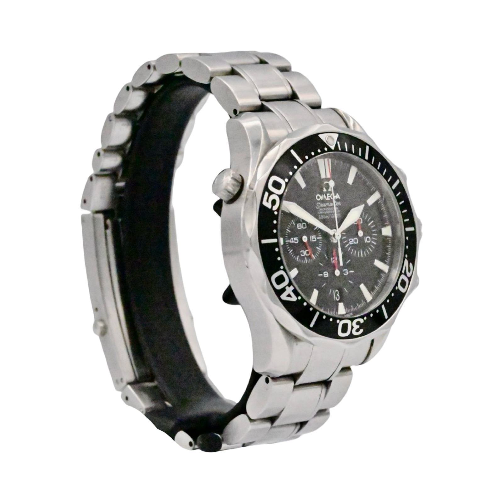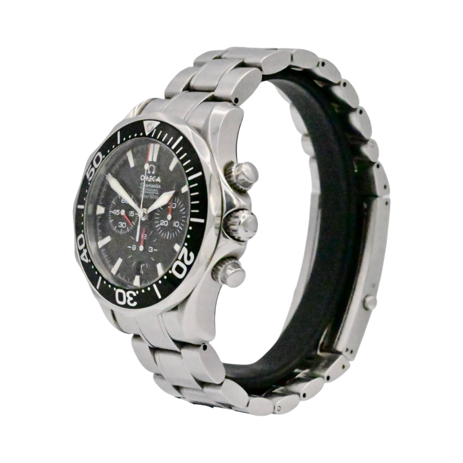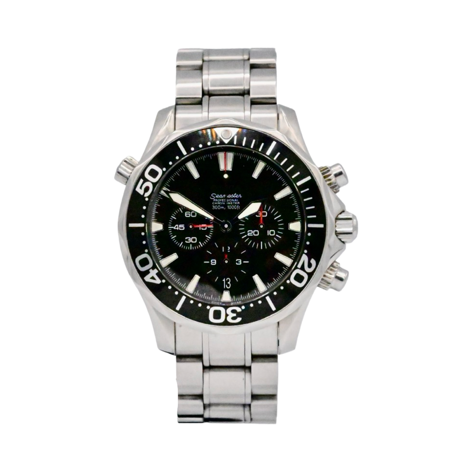 The Omega Seamaster Diver 300 is an Iconic timepice. This 43mm chronogrpah model is crafted from stainless steel and includes a black time-lapse bezel . The dial is also black with luminescent markers and a date window at 6 o’clock.