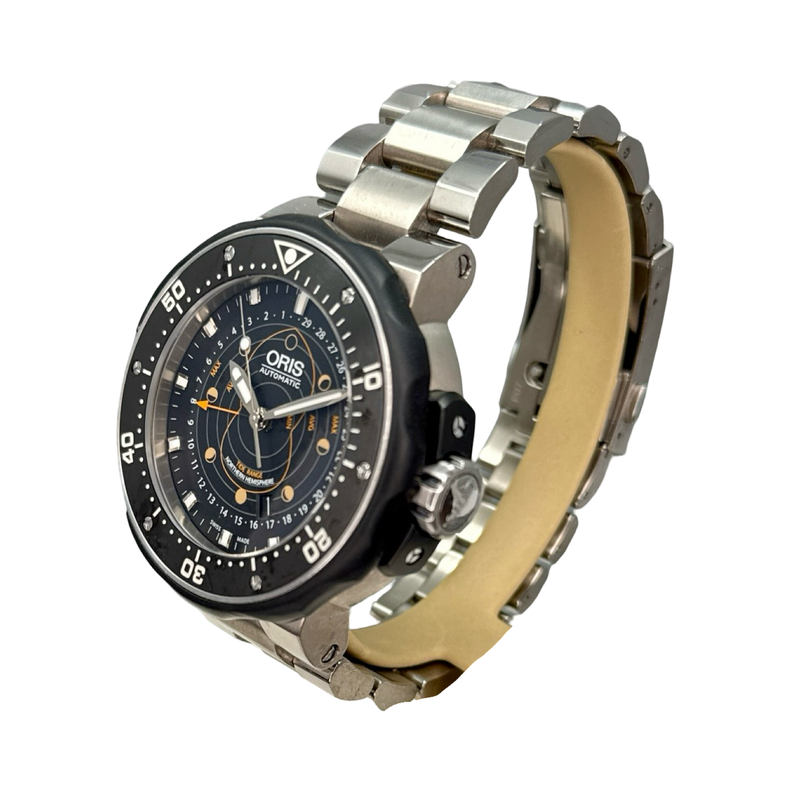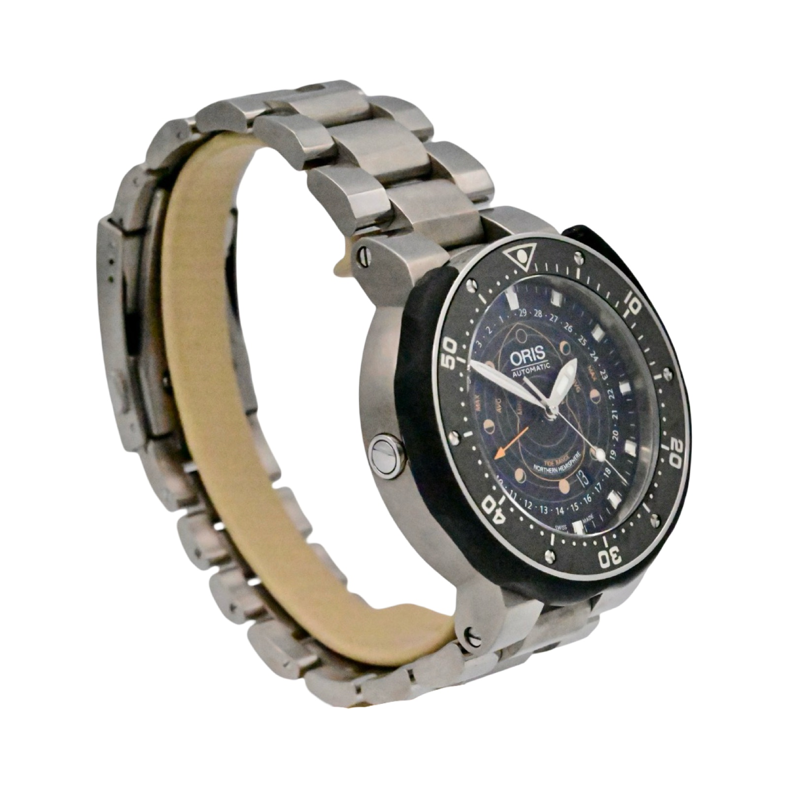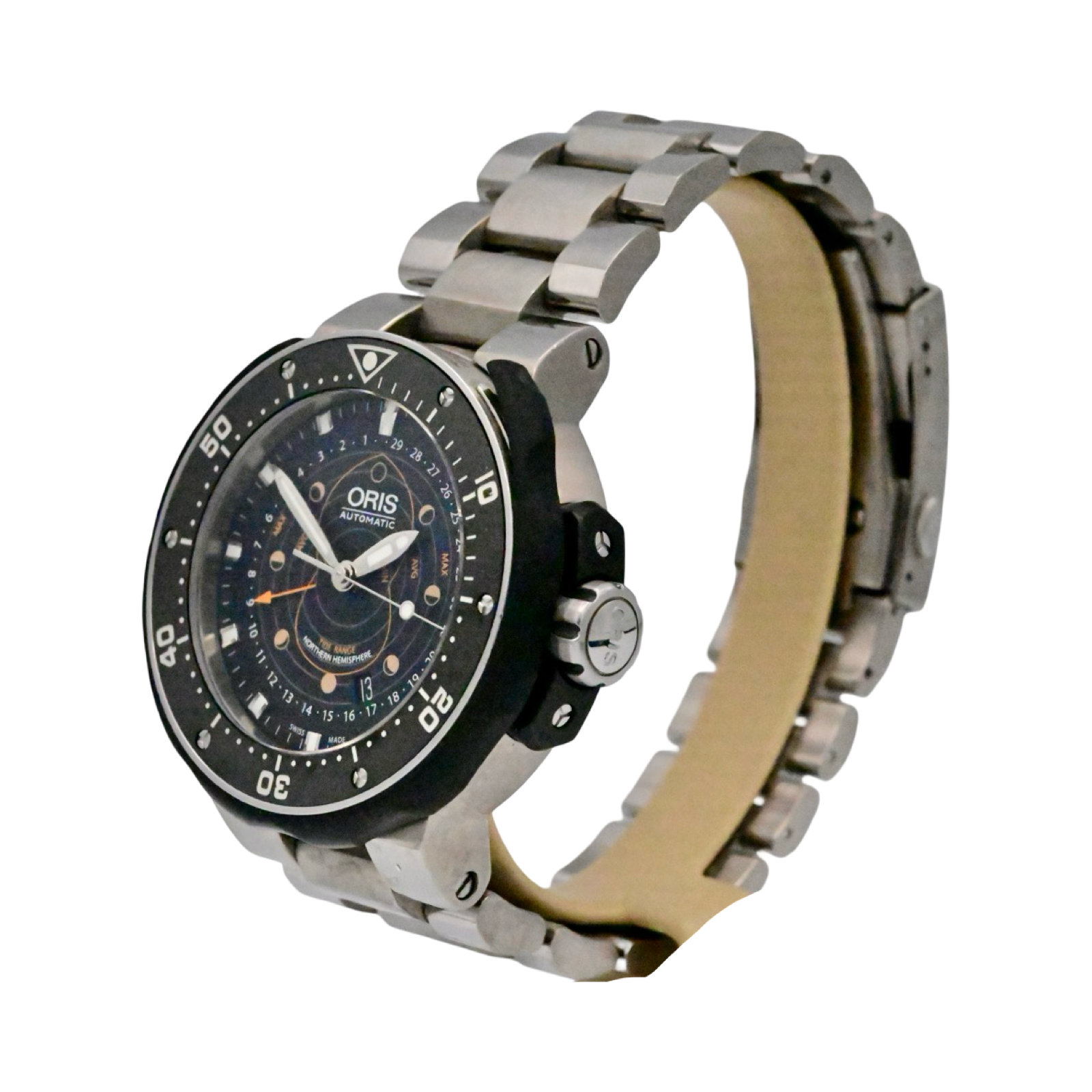 Titanium case with a titanium bracelet. Black dial with silver-tone hands and index hour markers. Minute markers around the outer rim. Dial Type: Analog. Luminescent hands and markers. Date display at the 5 o'clock position. Automatic movement. Scratch resistant sapphire crystal. Screw down crown. Solid case back. Case diameter: 49 mm. Round case shape. Fold over with safety clasp. Water resistant at 1000 meters / 3281 ft.. Functions: date, hour, minute, second, moonphase indicator. Additional Info: waterproof presentation box set, additional rubber strap, professional strap changing tools.