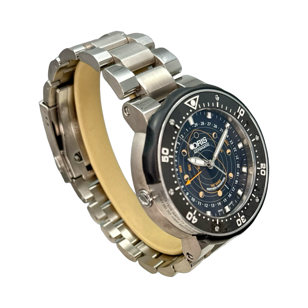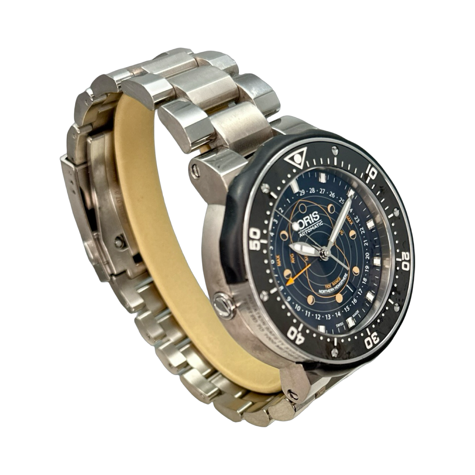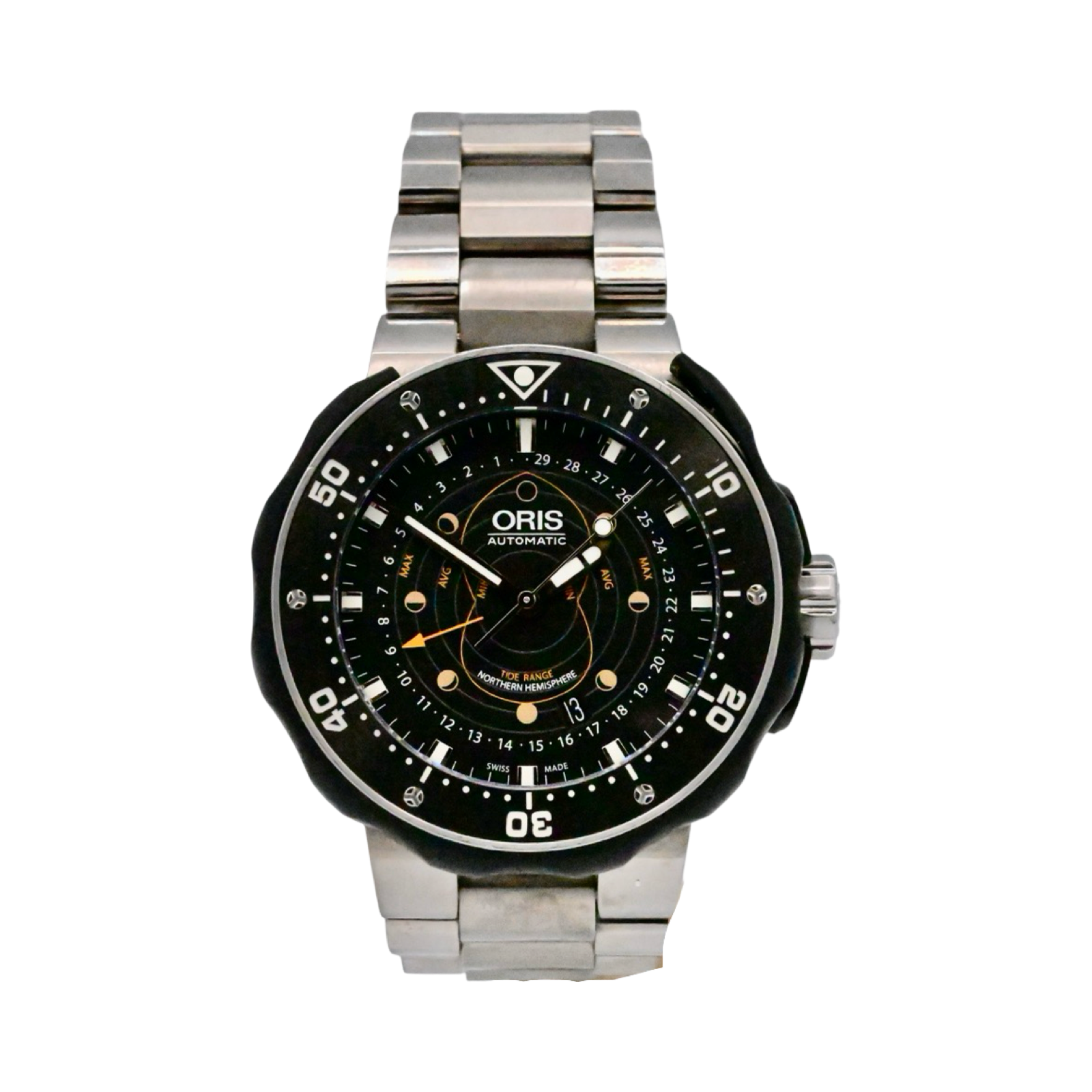 Titanium case with a titanium bracelet. Black dial with silver-tone hands and index hour markers. Minute markers around the outer rim. Dial Type: Analog. Luminescent hands and markers. Date display at the 5 o'clock position. Automatic movement. Scratch resistant sapphire crystal. Screw down crown. Solid case back. Case diameter: 49 mm. Round case shape. Fold over with safety clasp. Water resistant at 1000 meters / 3281 ft.. Functions: date, hour, minute, second, moonphase indicator. Additional Info: waterproof presentation box set, additional rubber strap, professional strap changing tools.