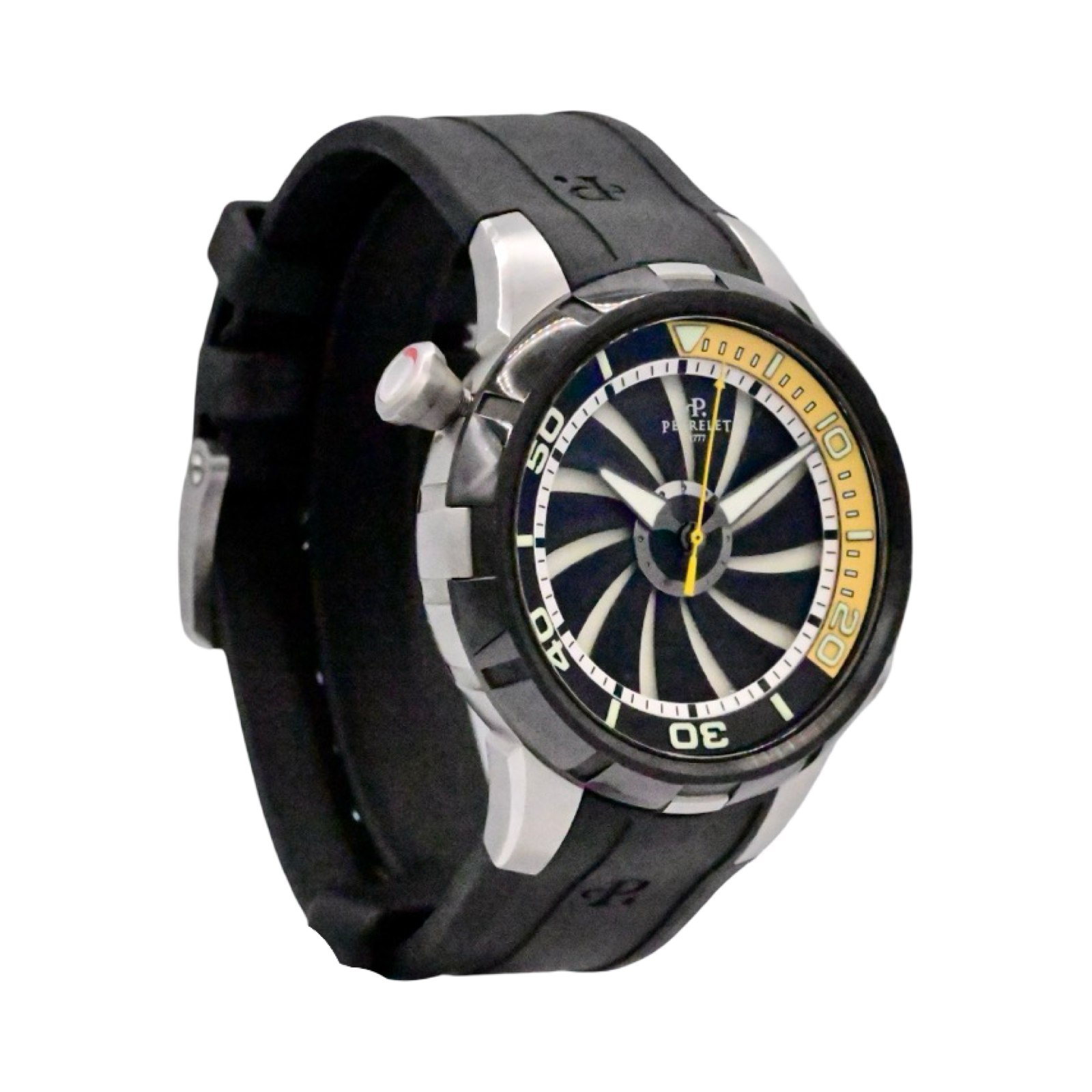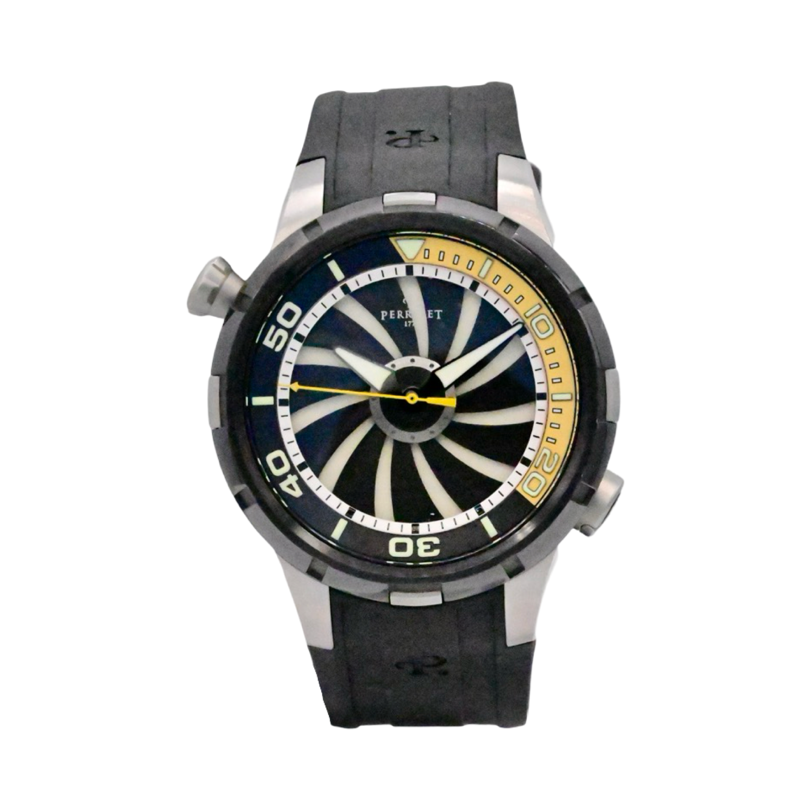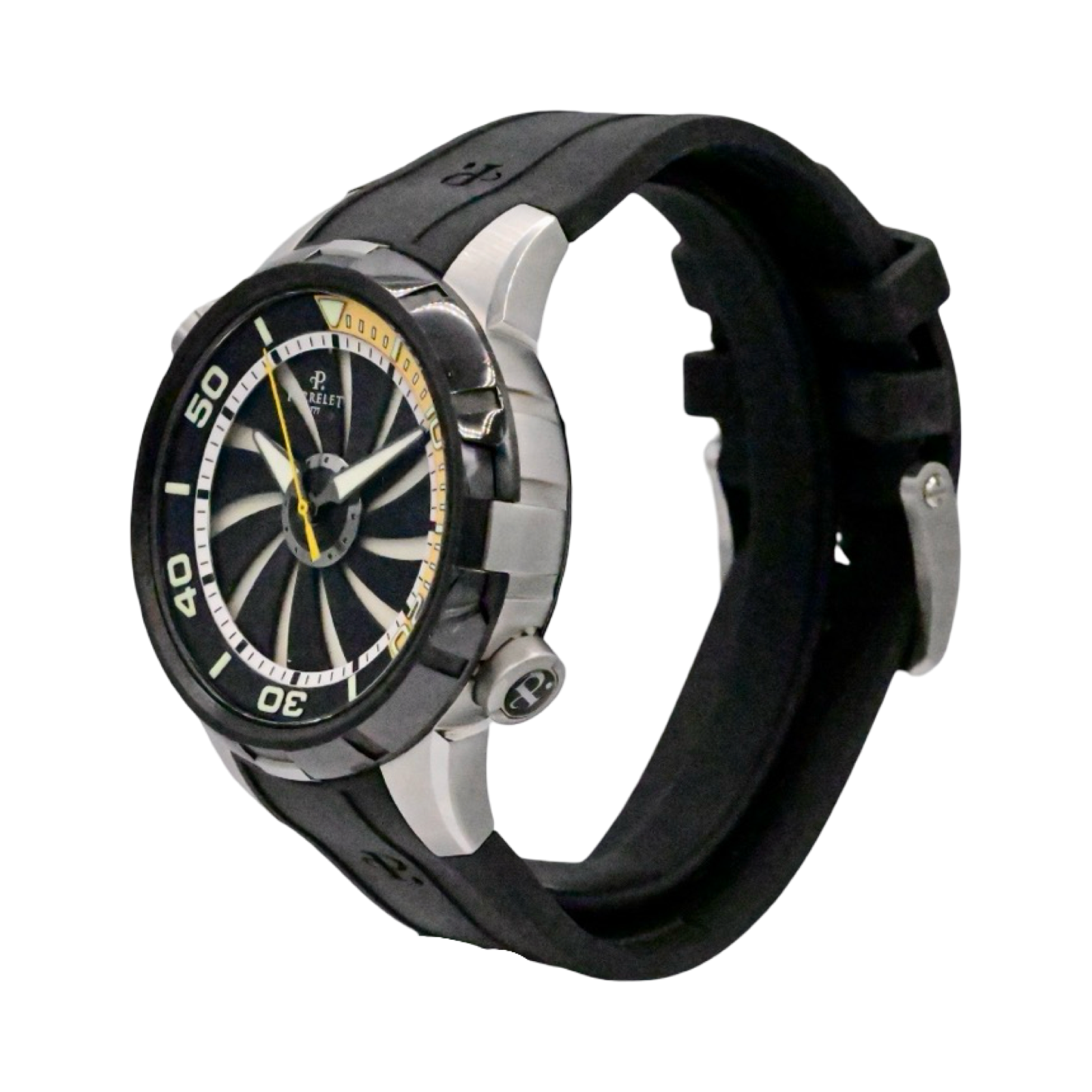 This model features a symbolic and functional style designed for exploring the ocean depths. The upper rotor, evoking a submarine propeller, rotates above an entirely luminescent dial that shines in the darkness with a truly fascinating glow. Dive times are measured on a two-tone inner bezel ring, cleverly built on two levels. The Turbine Diver asserts its powerful personality within a dedicated 47mm diameter case featuring a distinctive fluted motif and "paws" straddling the bezel. It appears in steel / PVD coated, water resistant to 300 meters.