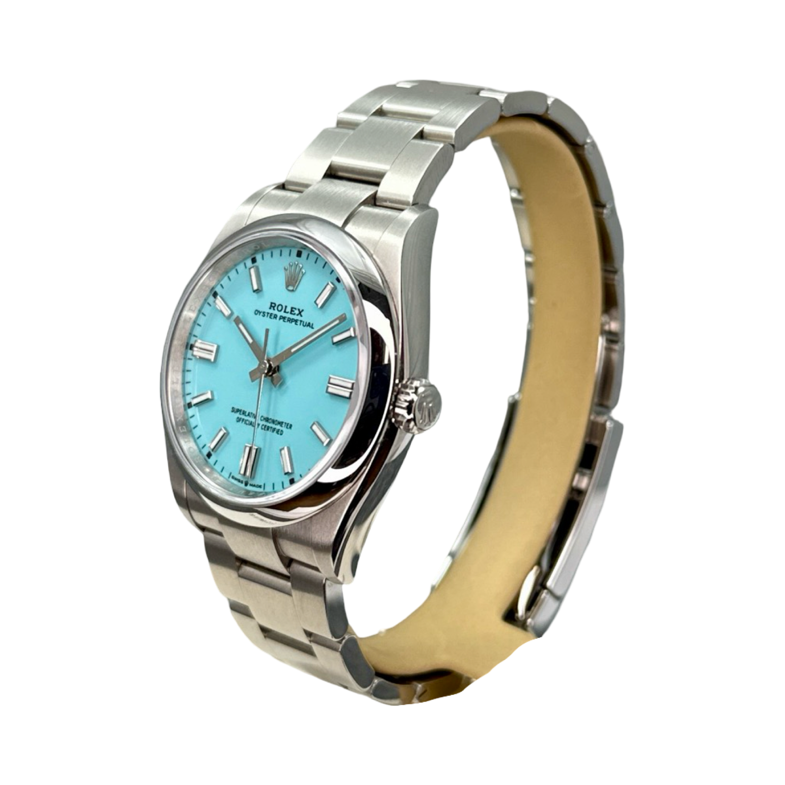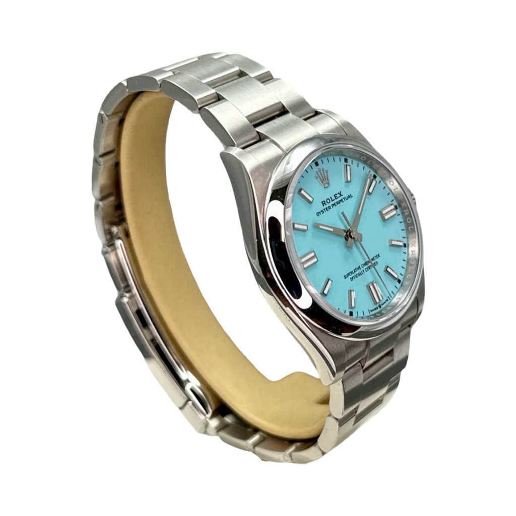 One of the Hottest Rolex right now are the pieces with "Stella Like" dials. This Tiffany Blue OP36 is one of the hottest