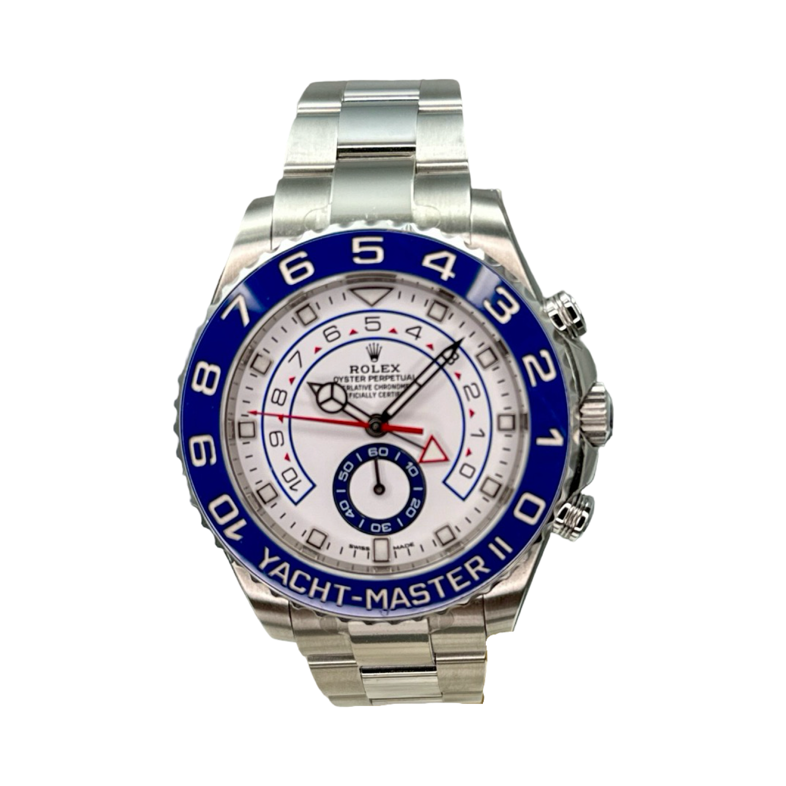 Whether timing steaks on the grill, a time out for your toddler, or actually racing in a regatta, the count-down timer on the Yacht II is perfect for you. The largest of the Rolex professional models, enjoy the substantive watch on your wrist. Iconic blue colored bezel makes this piece pop.