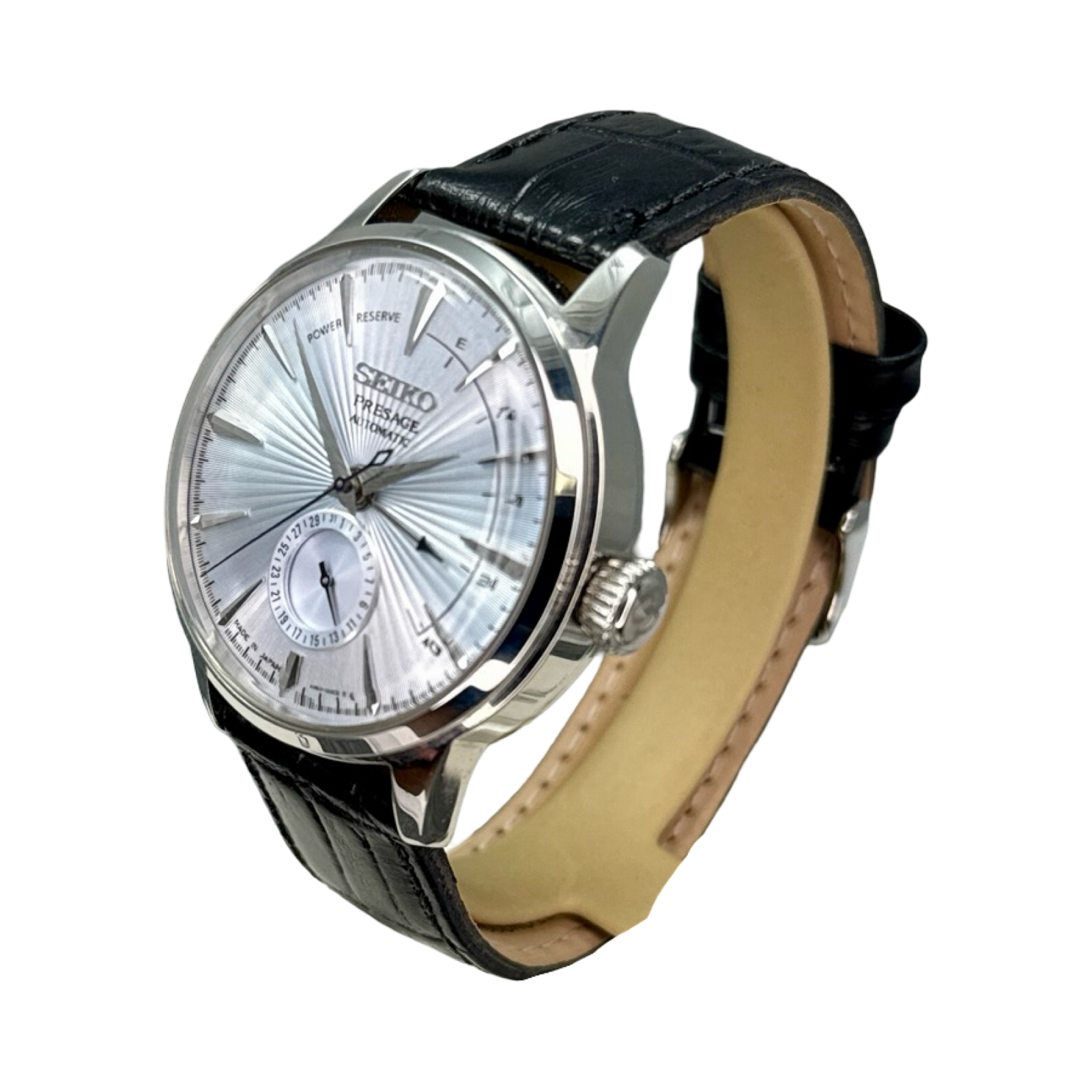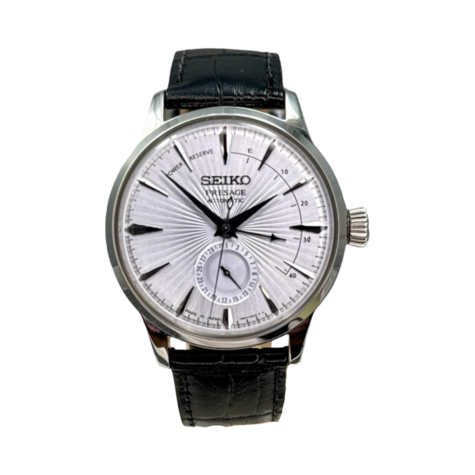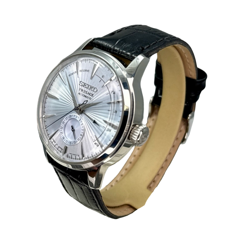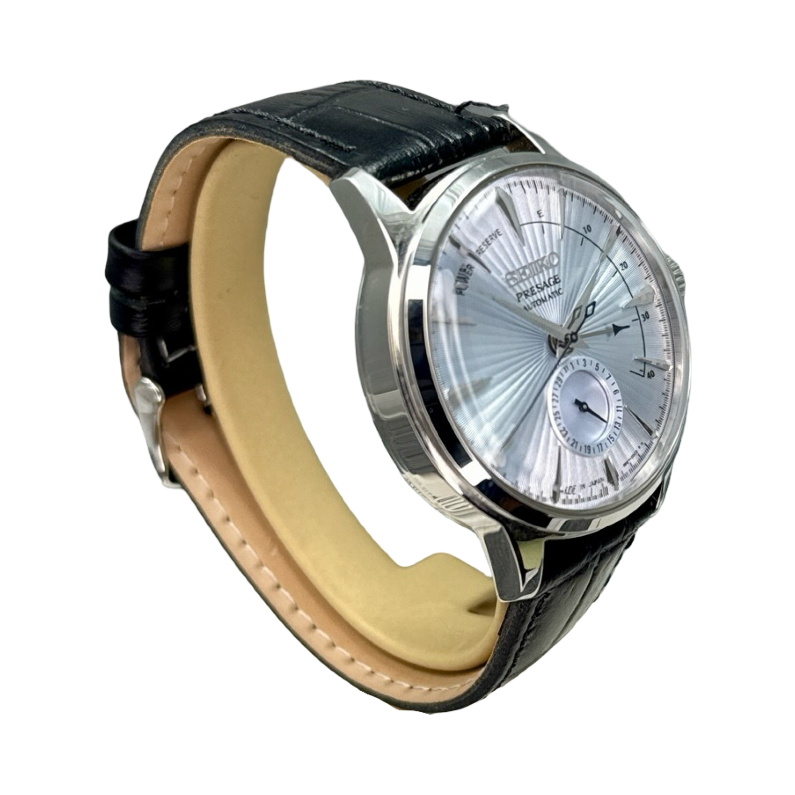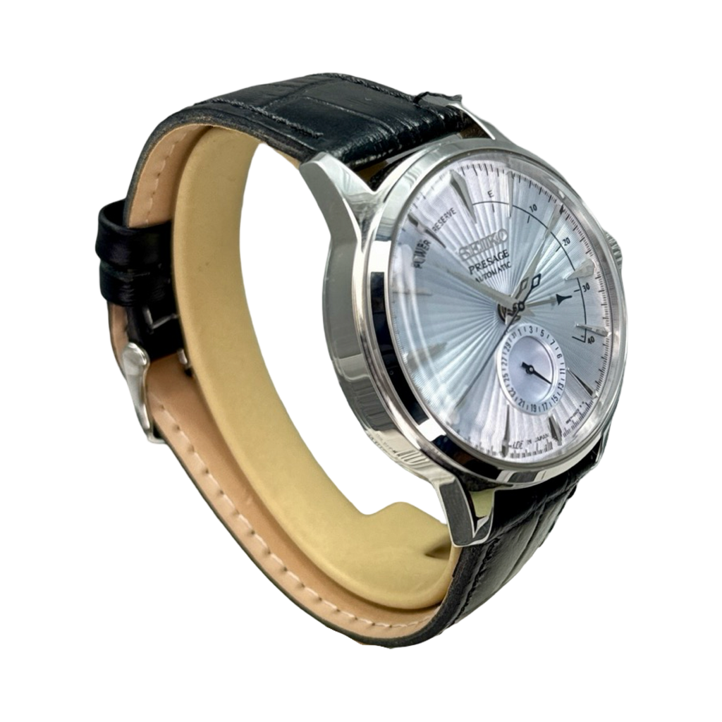 The exquisite Seiko SSA334, also known colloquially as "Cocktail Time", is powered by the premium Seiko 6R15 caliber self-winding movement that can also be hand wound and hacked. It is the same caliber that powers most of the Seiko Prospex line of watches. The movement has a generous 50 hour power reserve. The case has a polished finish and radiant textured dial silvertone hands and hour markers. A date display is shown at the 6 o'clock position. With a power reserve dial from 12 to 3.The black leather strap has a deployant clasp for quick on and off. A scratch resistant Hardlex crystal is used along with an exhibition back that allows you to view the movement in action. Water resistant to 50 meters.