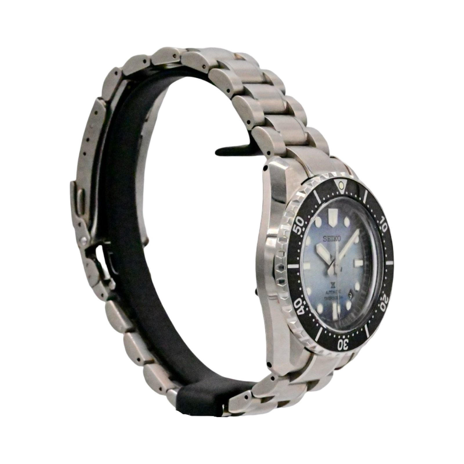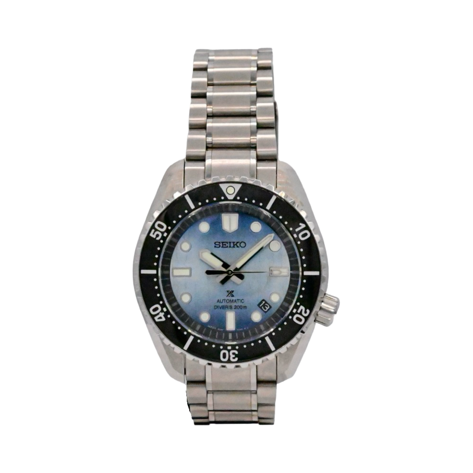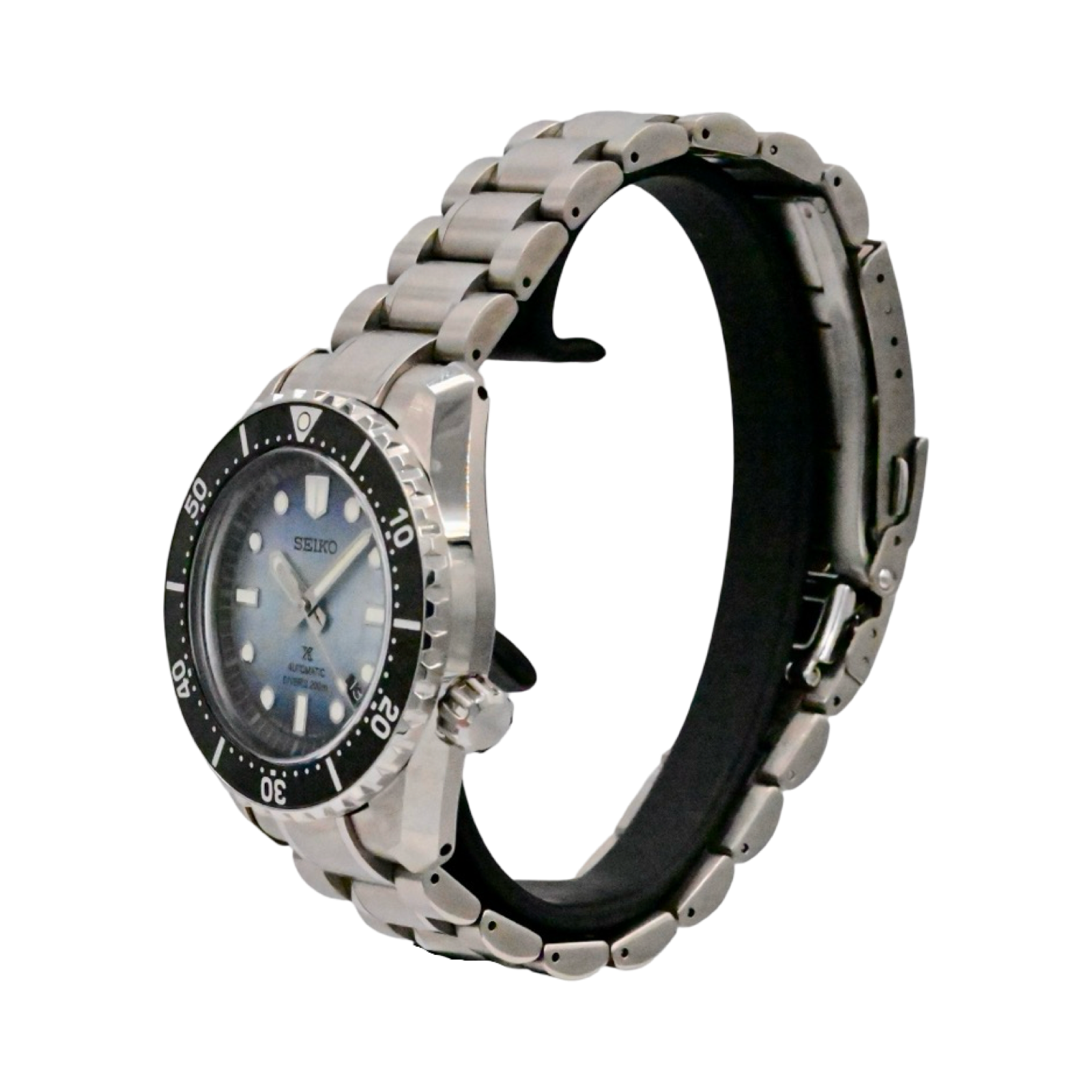 1968 Heritage Diver's Watch. Designed for those who treat life as the ultimate adventure, the Seiko Prospex line meets every challenge with technological excellence and style. Part of a rich legacy of innovation in high-intensity timekeeping, Prospex continues to celebrate a long history of sports watch excellence with re-creations and re-interpretations of landmark achievements. A streamlined and updated re-interpretation of Seiko’s landmark 1968 diver’s watch, this extraordinary timepiece has been inspired by the dangerous, yet compelling, world of undersea cave diving, complete with special features designed to enhance safety for intrepid divers. The unique patterning and gradation of the light teal blue dial evoke the magnificent underwater cave formations as illuminated by the diver’s light. While the hands, markers and 12 o’clock marker on the black uni-directional rotating elapsed timing bezel all offer LumiBrite coating, the glowing color is different on the minute hand and the bezel to ease critical elapsed time measurement during these hazardous dives