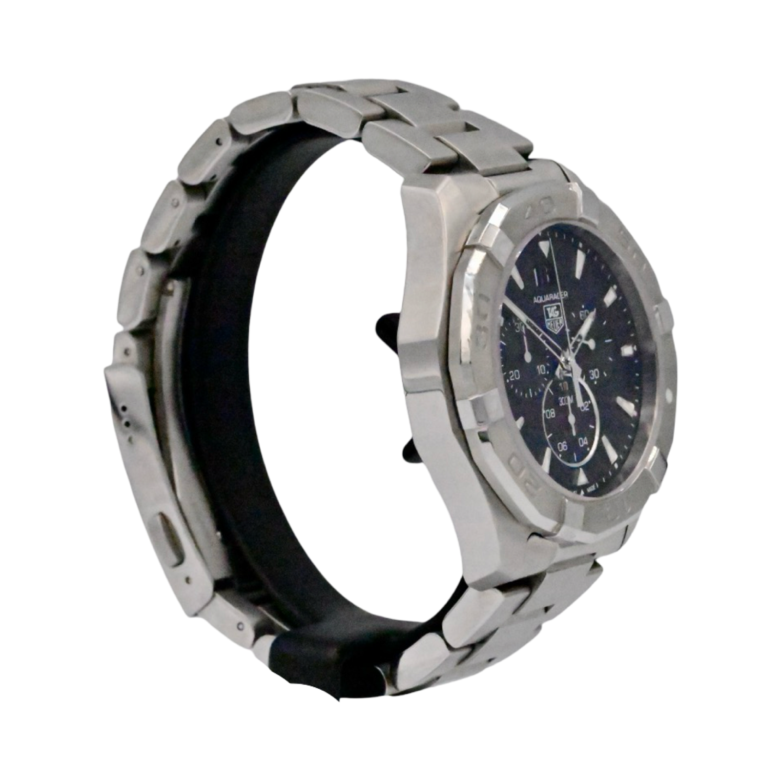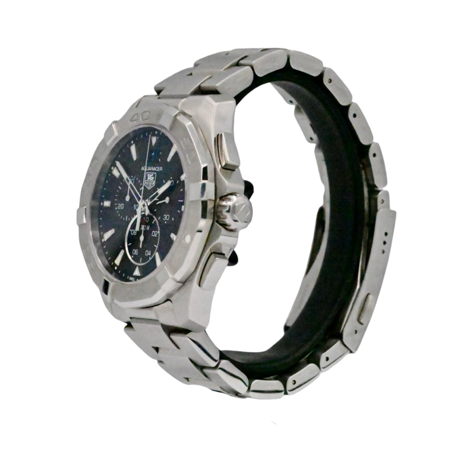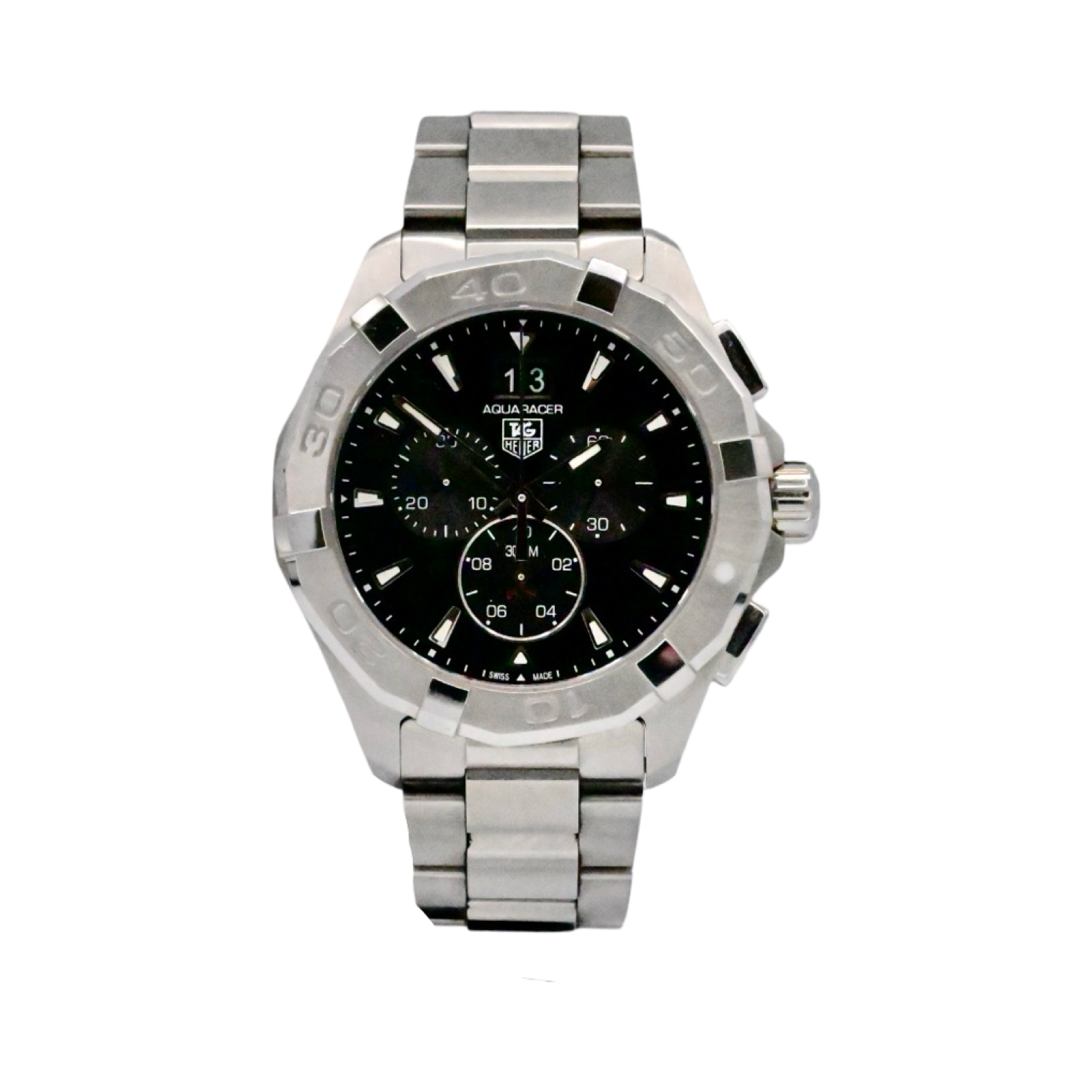 Pre-Owned Tag Heuer Aquaracer watch, features a 43mm stainless steel case with a steel time lapse bezel surrounding a black dial on a stainless steel bracelet with folding buckle. Functions include hours, minutes, small seconds, date, chronograph. This watch comes with the original box and papers