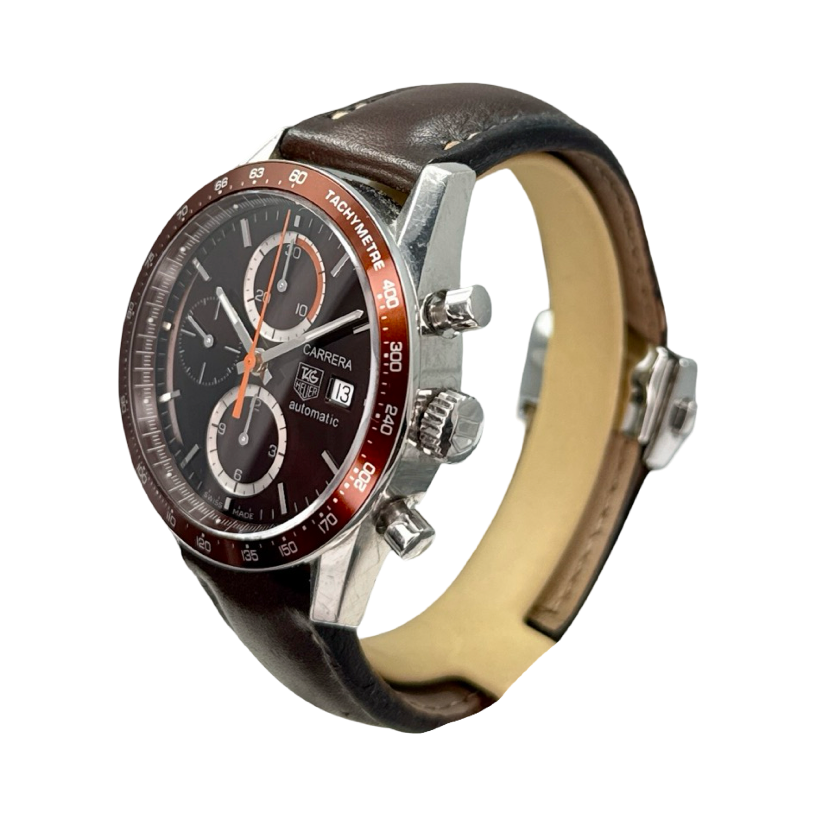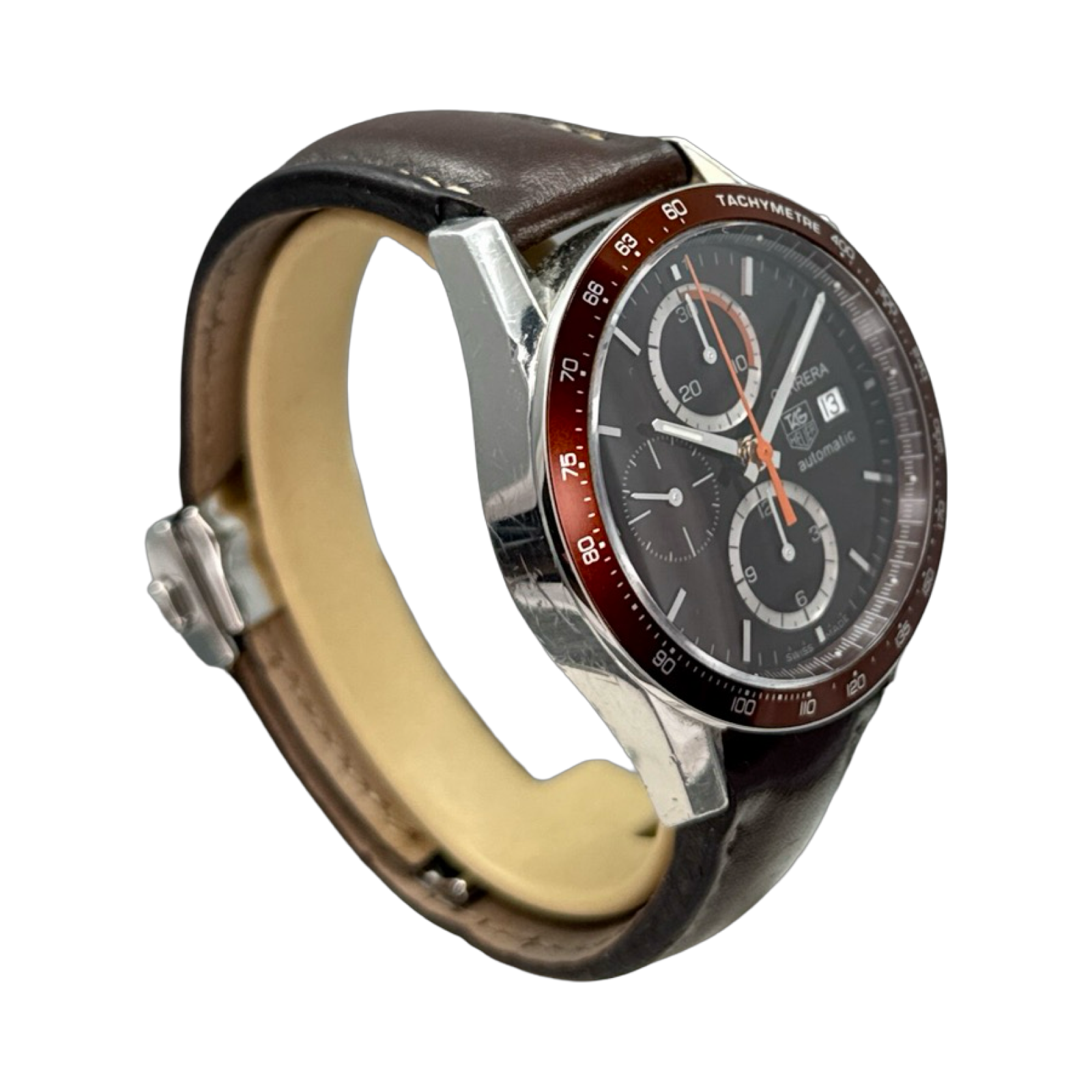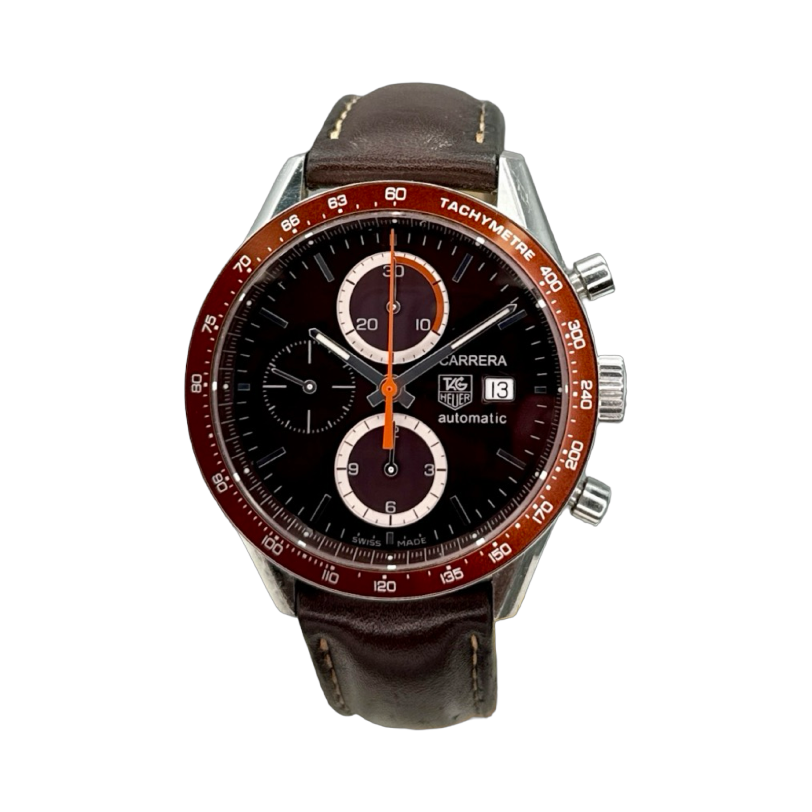 Swiss-made, this bold TAG Heuer Carrera is a perfect  43mm watch. This model features a Steel case and a Calibre 16 Automatic movement. The brown bezel and dial is a definite talking point.