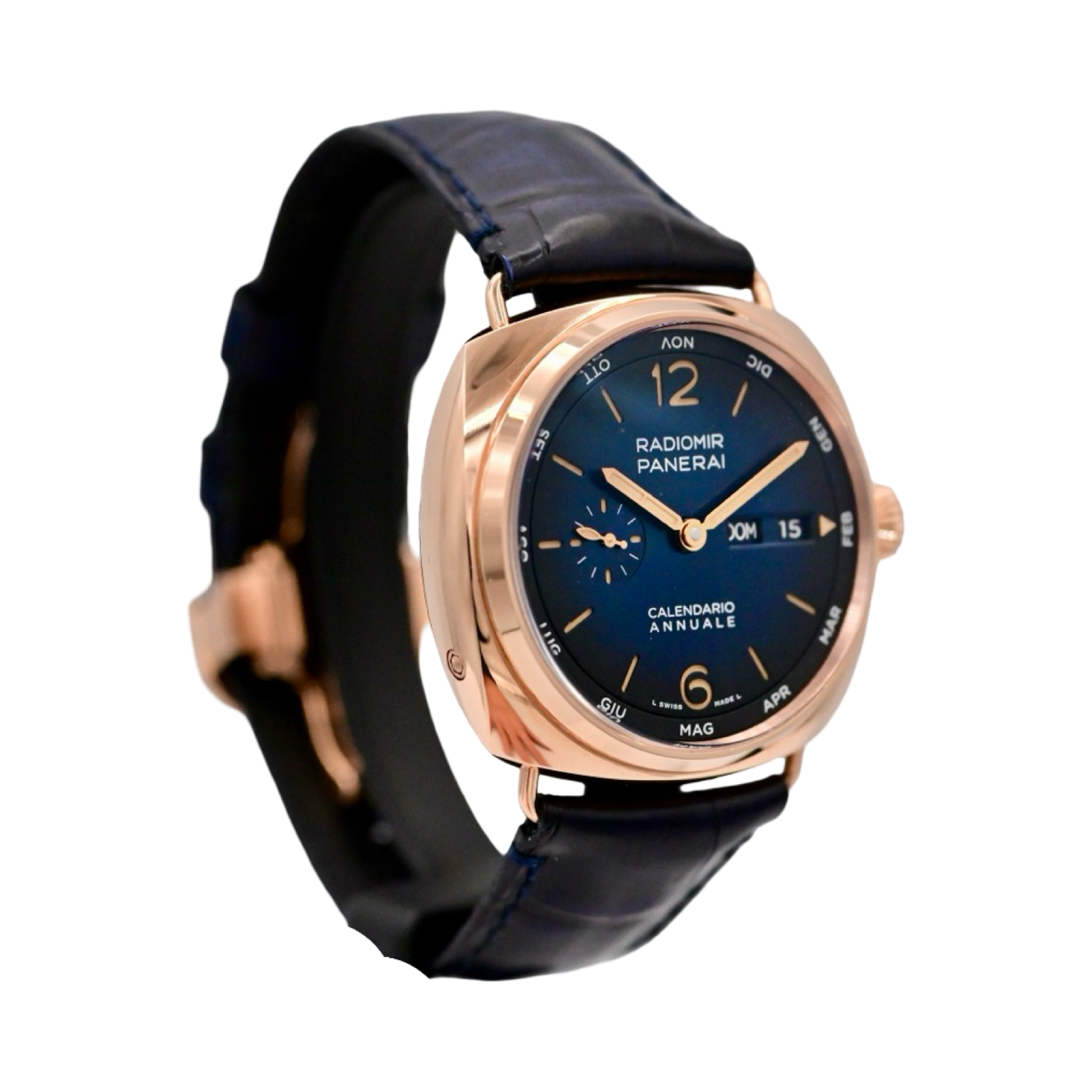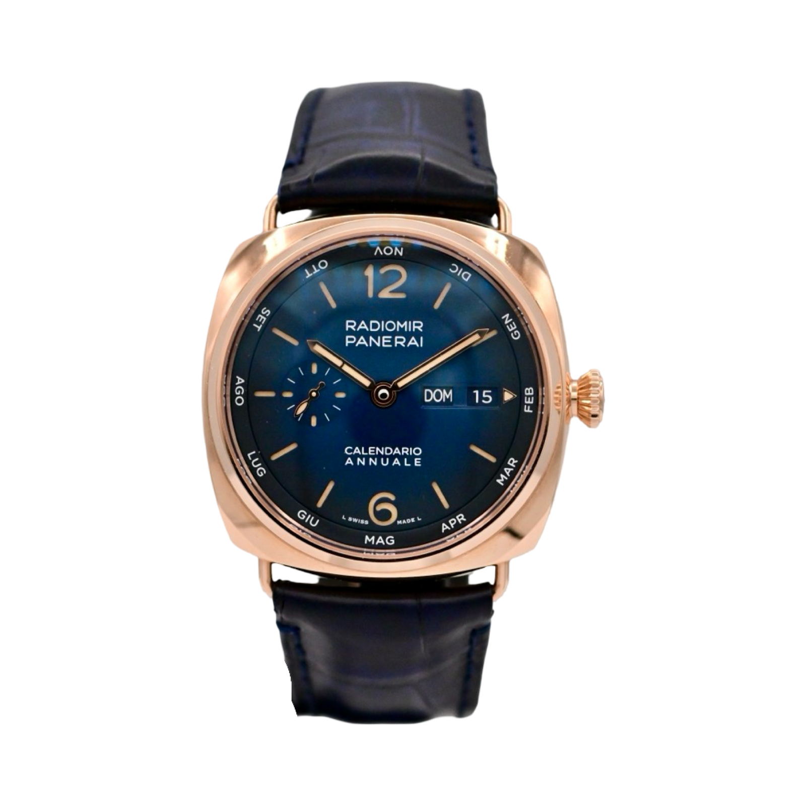 The Panerai Radiomir Annual Calendar / Calendario Annuale PAM01363 debuted in 2023 as the brand's first annual calendar courtesy of its caliber P.9010/AC. This Radiomir has a case of 45.00mm in Goldtech, and a Blue dial with gradient finish.
