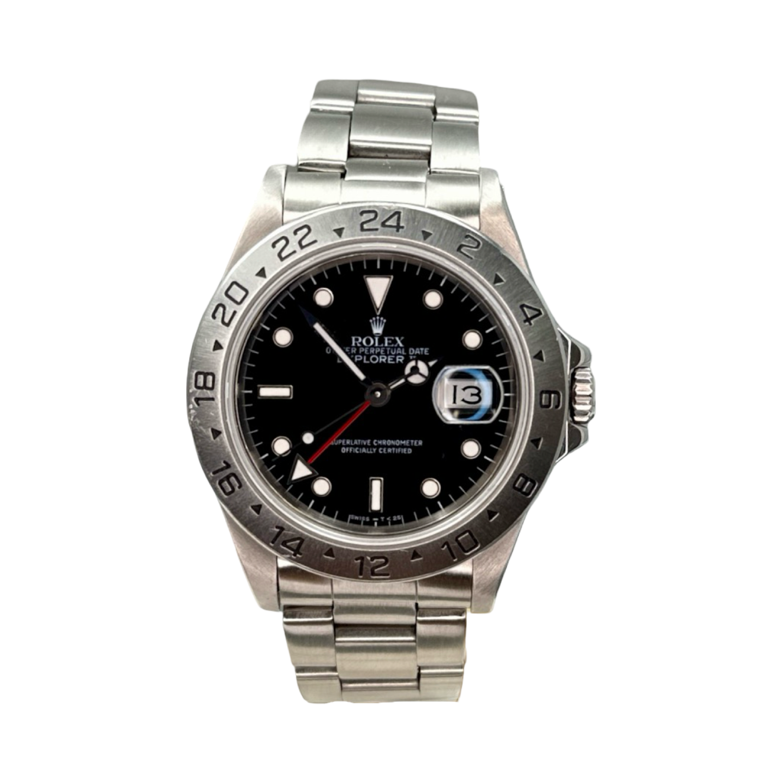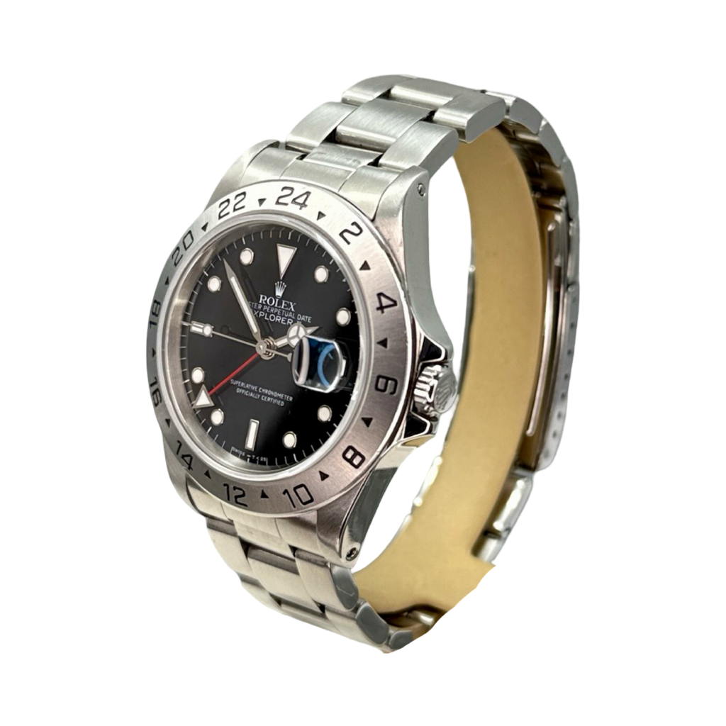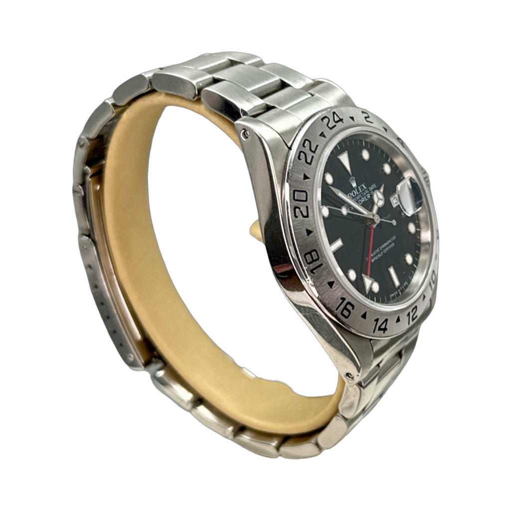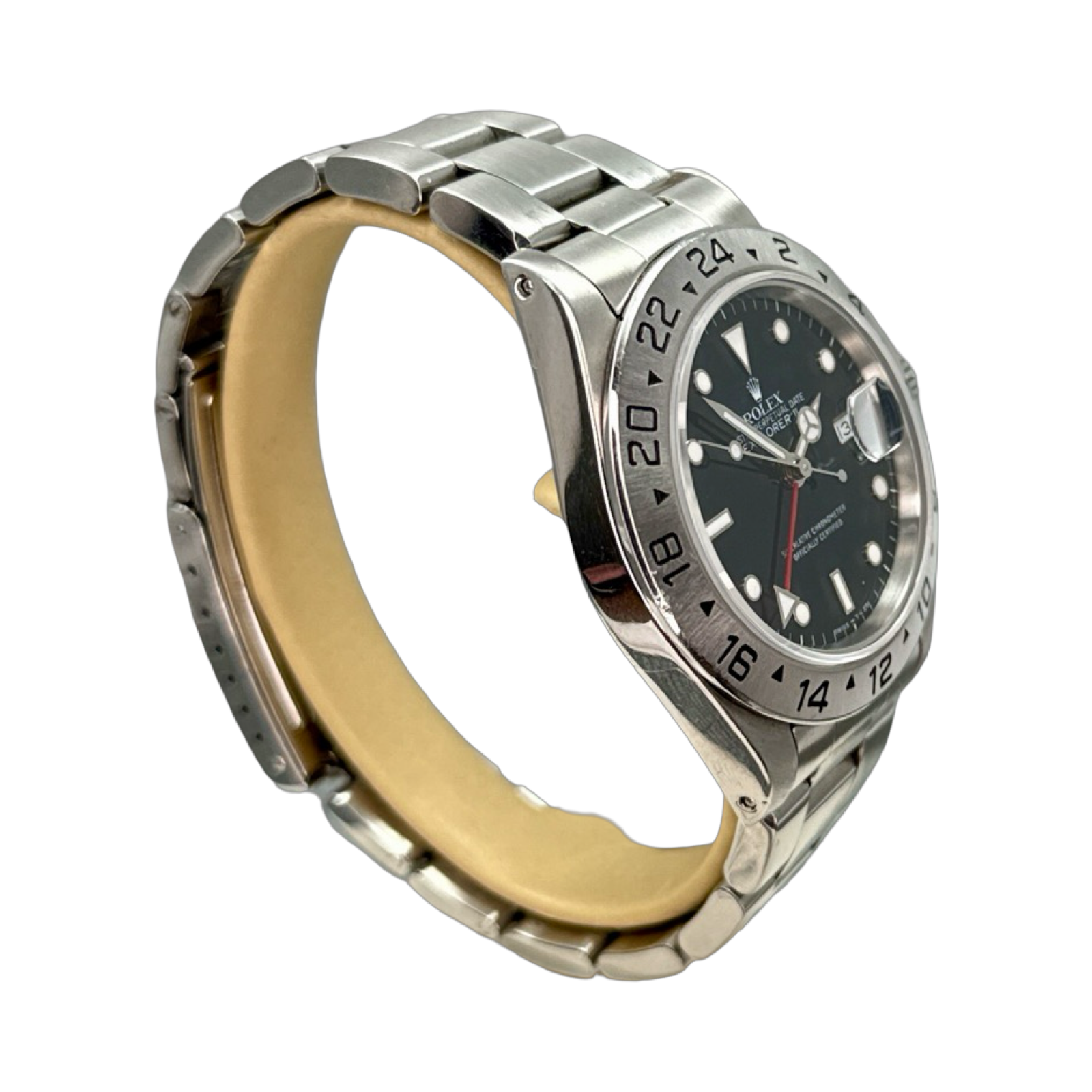 The Explorer II may be the perfect GMT watch. The splash of red on the GMT hand give it Character. This particular piece with the tritium dial is relatively early in the 22 year run for this reference. Preowned in very good condition this piece is a must for any traveler.