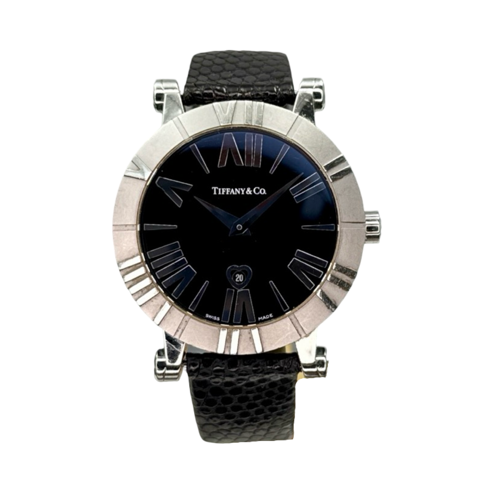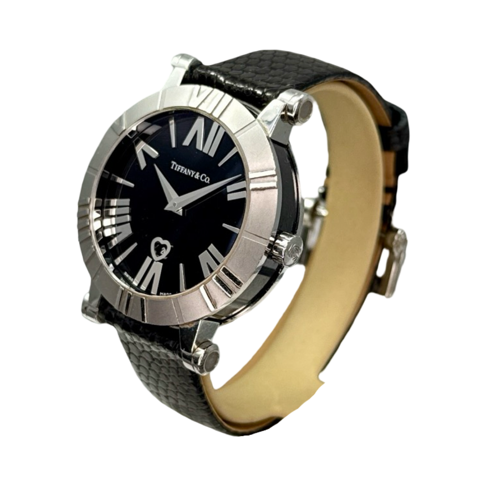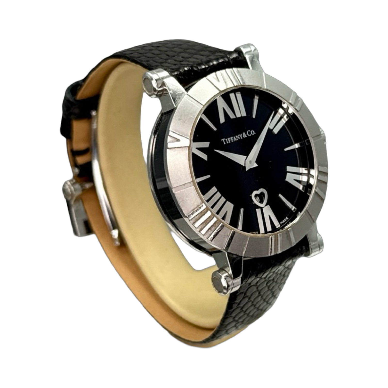 The Tiffany & Co Z1300 is a model fron the company's Atlas line. Bold Roman Numerals on the bezel and crisp black dial with heart shaped date window are just a couple signatures of this piece.