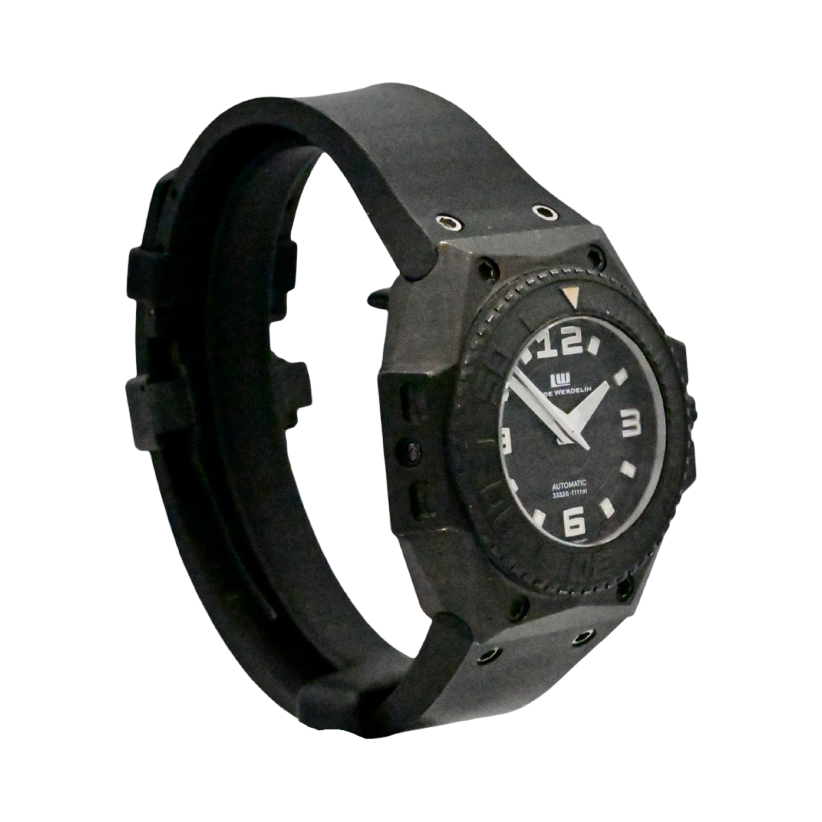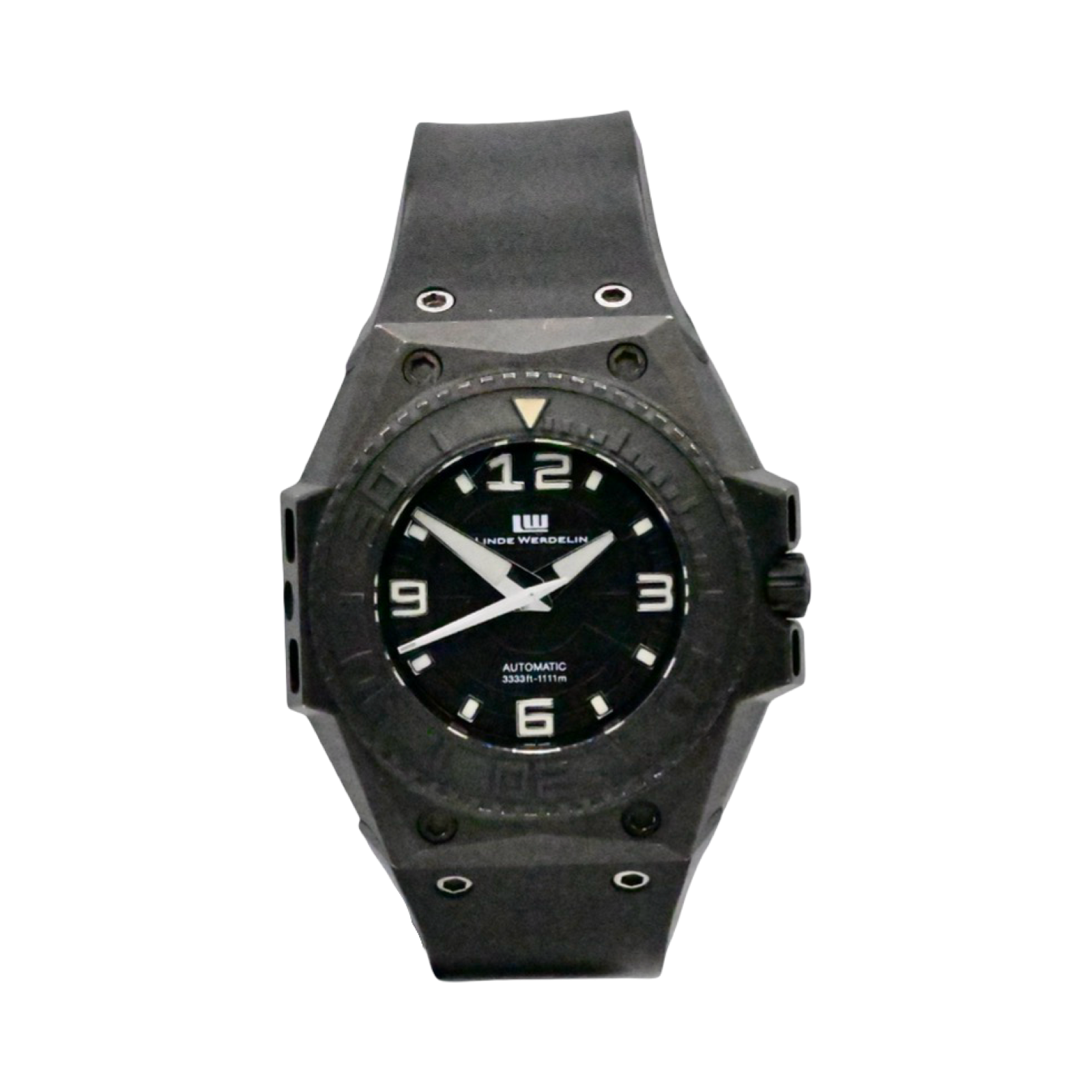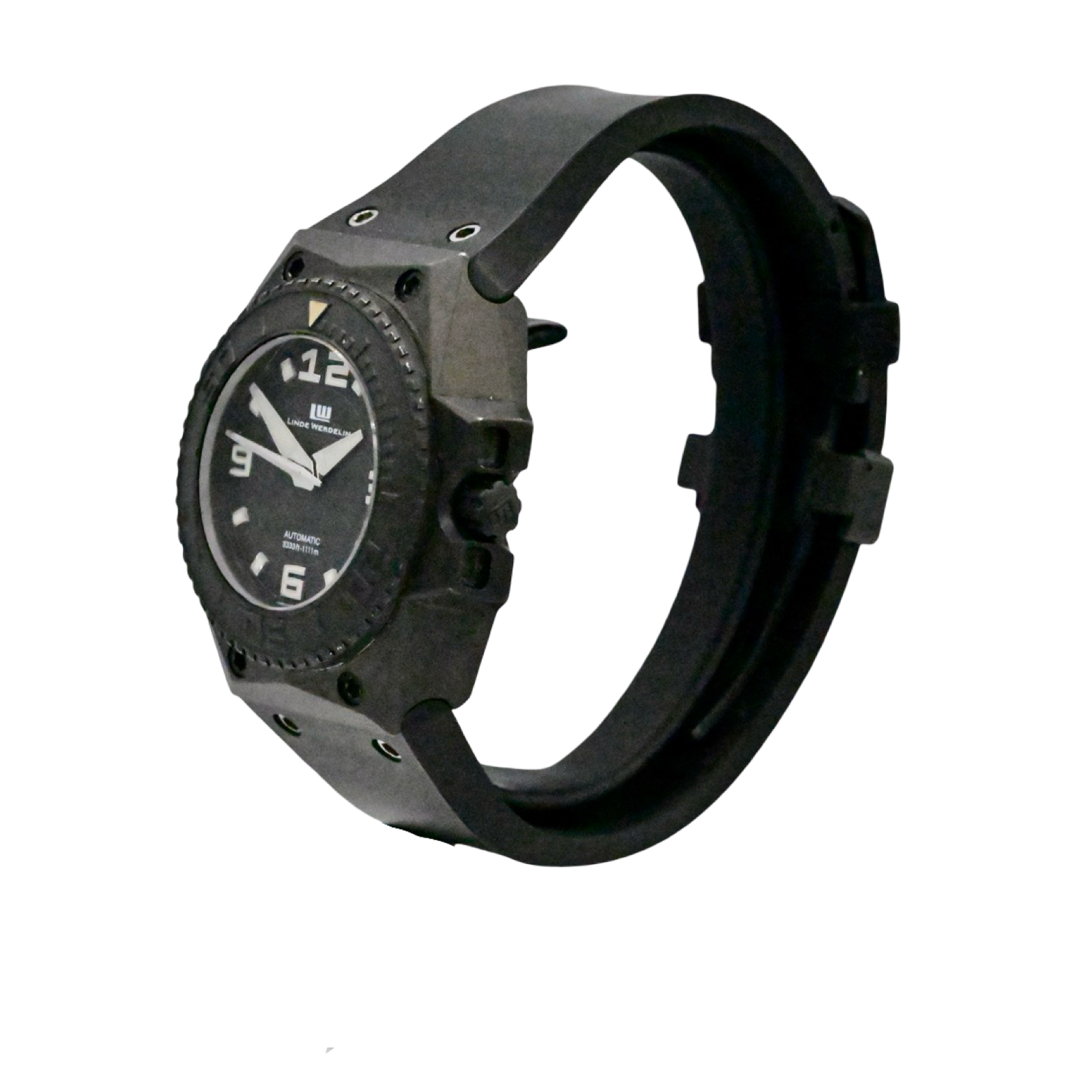 This Rare Linde Werdelin Oktopus features a 46mm titanium case with a solid case back on a black rubber strap. This watch also sports a black dial with luminous hands and index dial markers covered by scratch resistant sapphire crystal.
