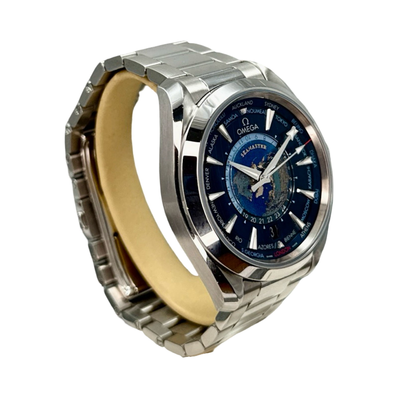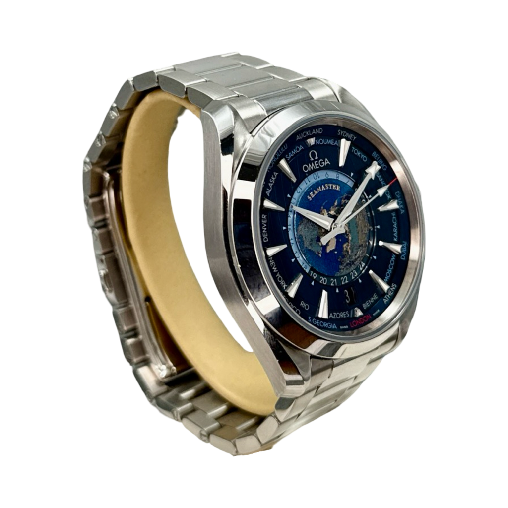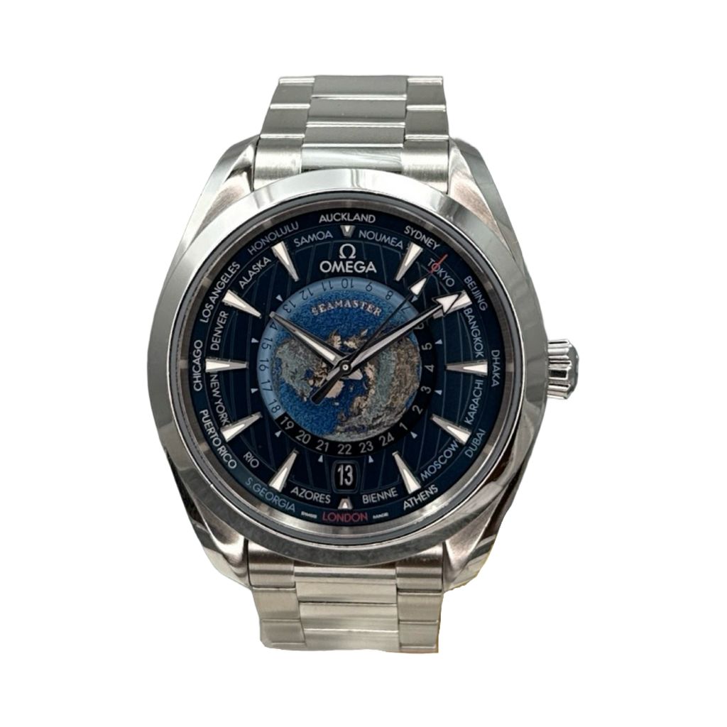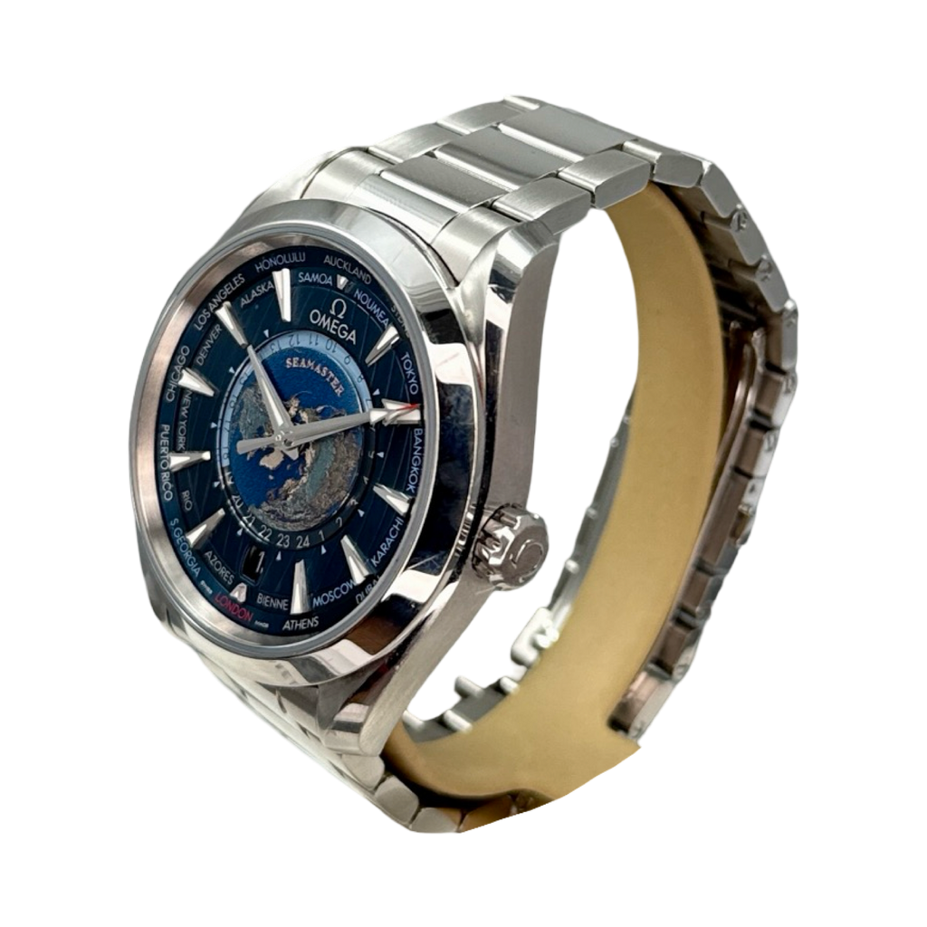A wonderful example of the classic style watch by Omega. The classic horizontal decking on the dial puts forth wonderful color and light play. This one with asteel braceletp speaks to the heart of tradition. The Map of the World is the true conversation starter of this wonderful watch.