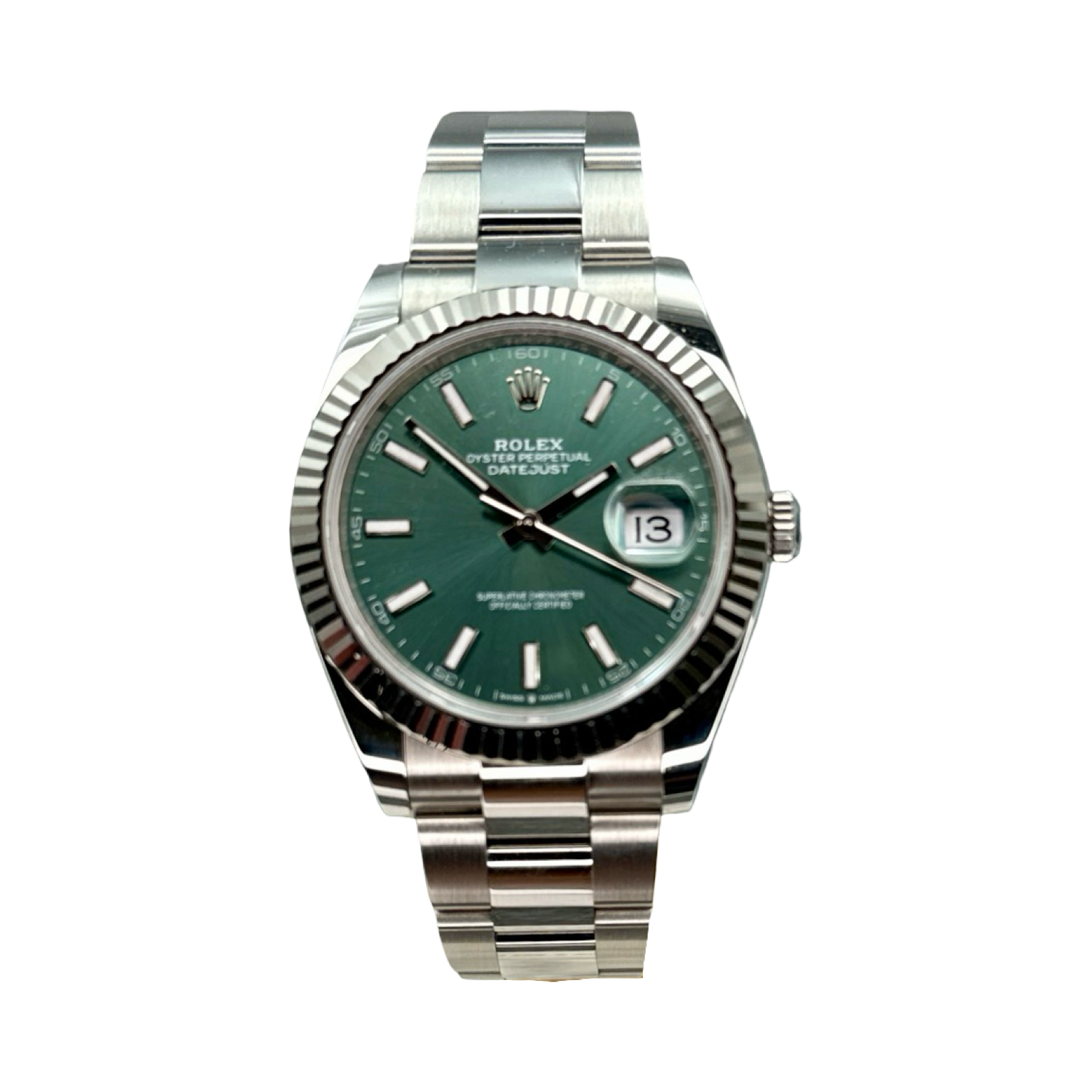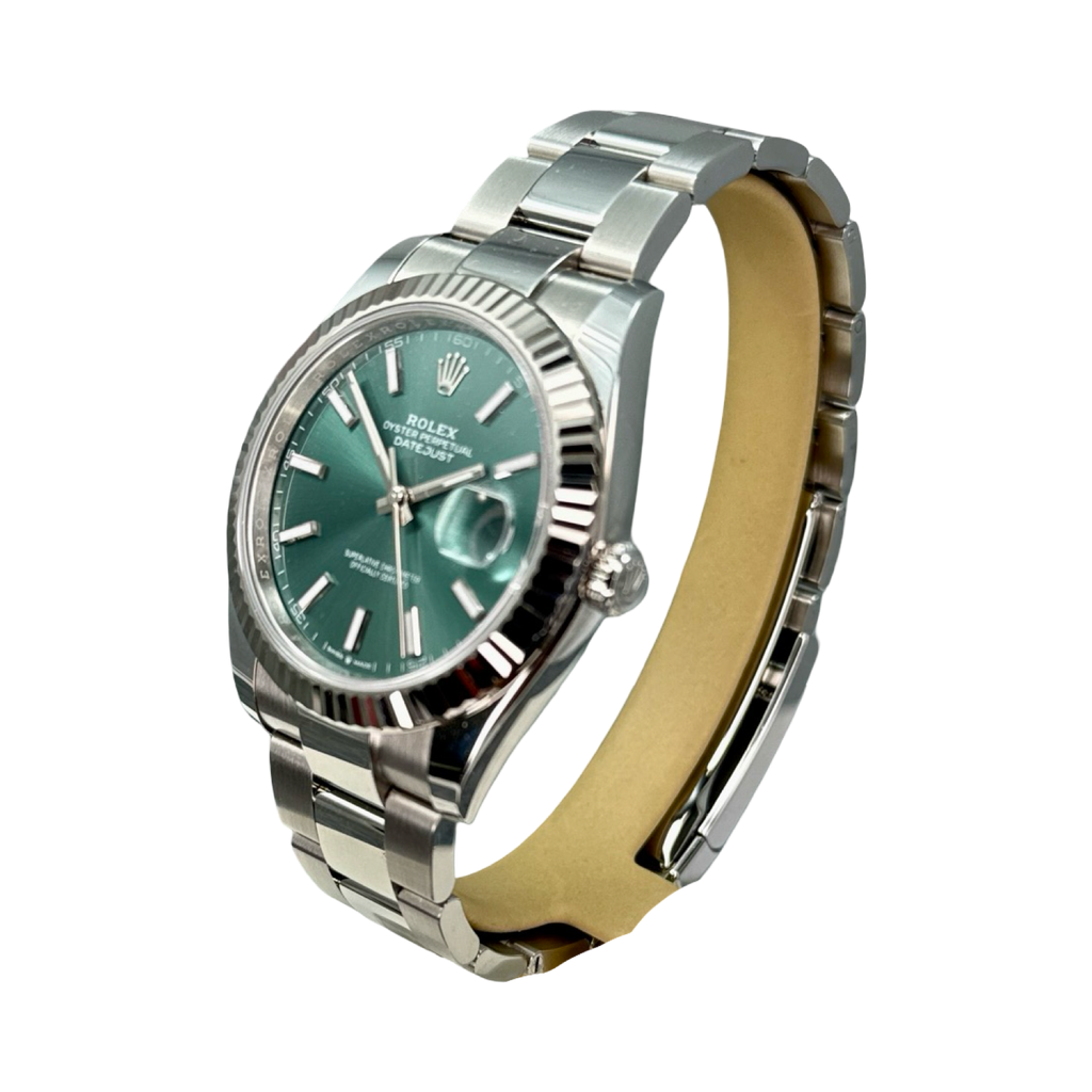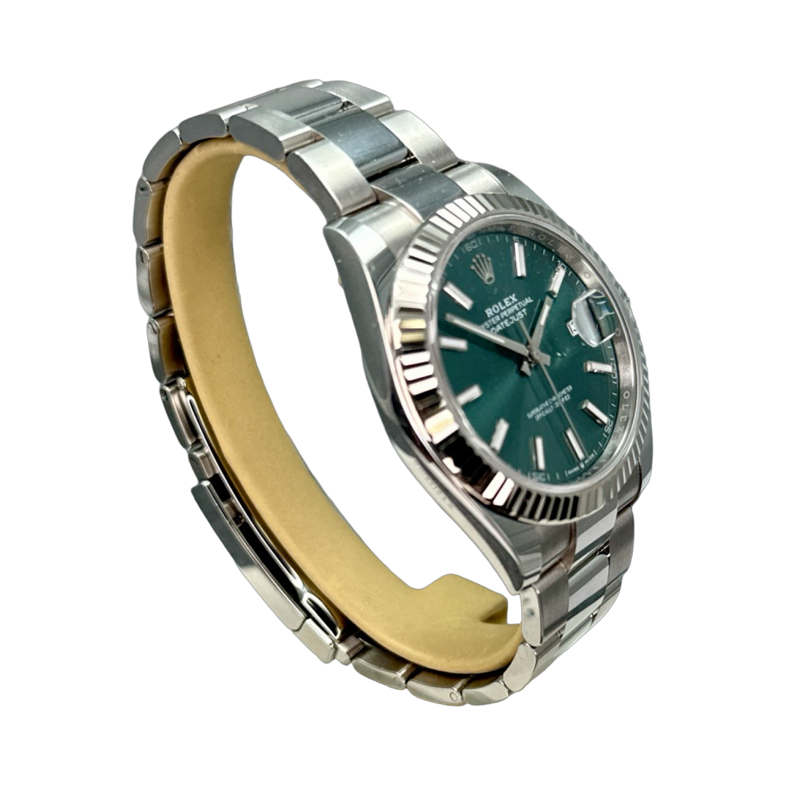 This is the quintessential Rolex at this time Fluted Bezel Oyster Bracelet and highly sought after Mint Green stick dial. At 41mm it wears perfectly on the wrist