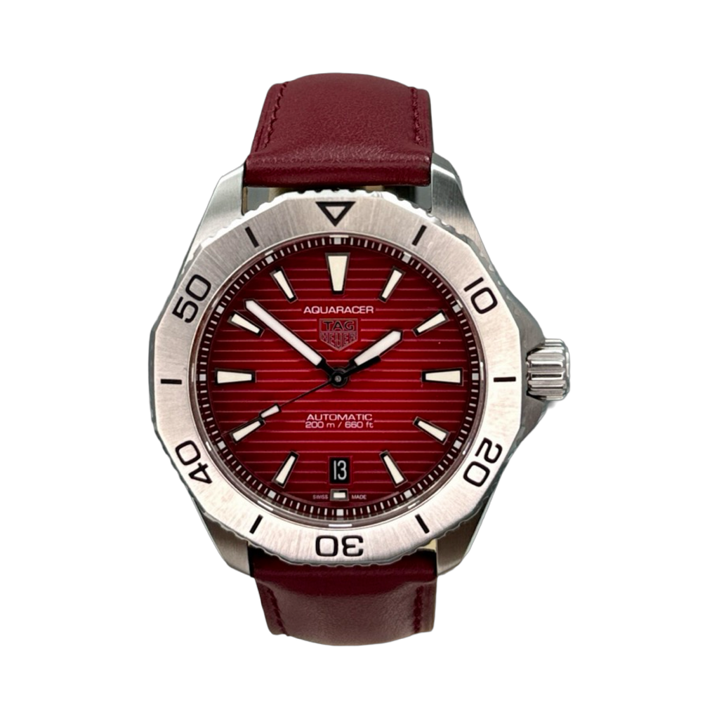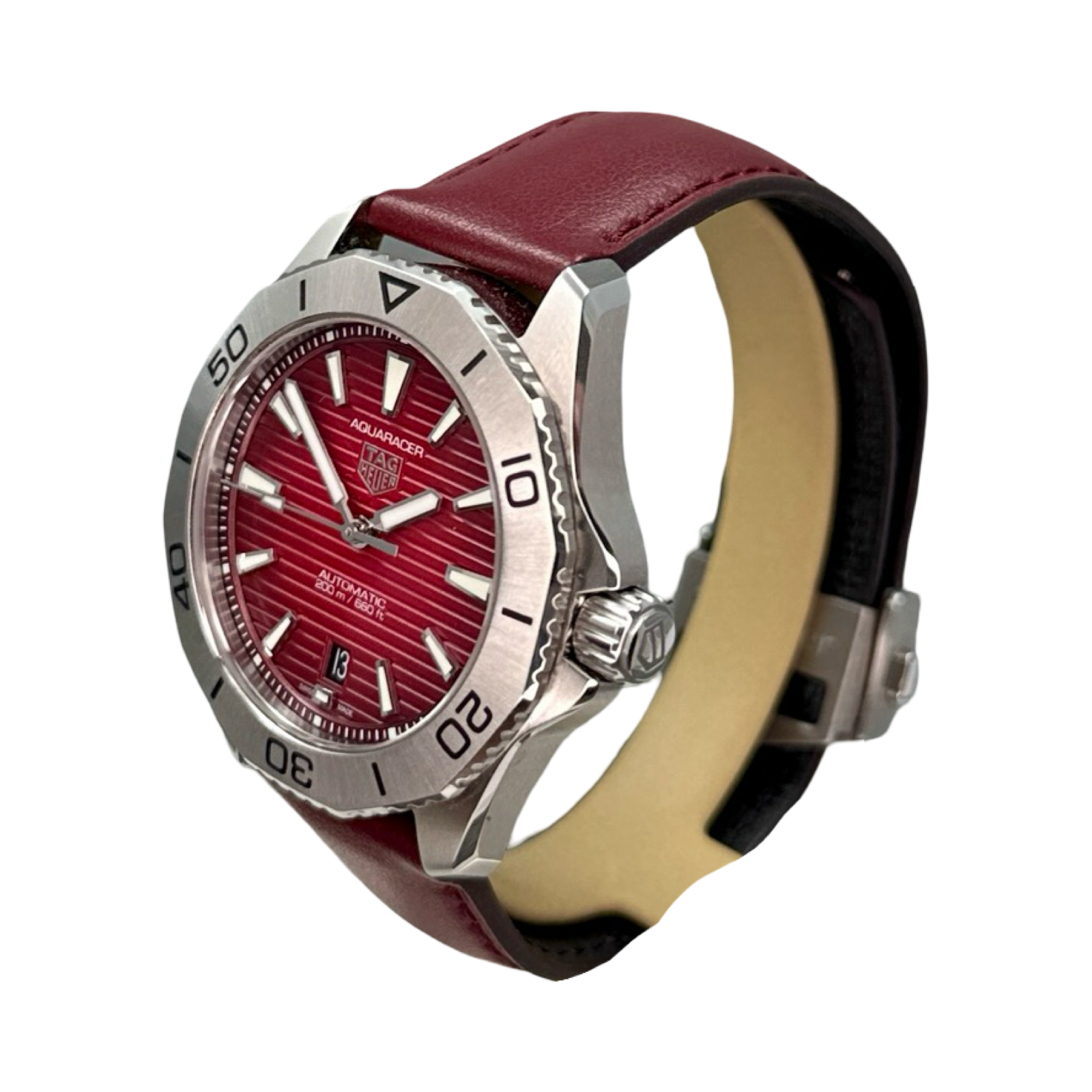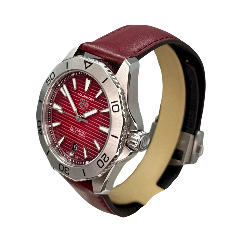 Pre-Owned Tag Heuer Aquaracer watch, features a 43mm stainless steel case with a stainless steel bezel surrounding a reddial on a red leather strap with folding buckle. Functions include hours, minutes, seconds, date. This watch comes with the original box and papers