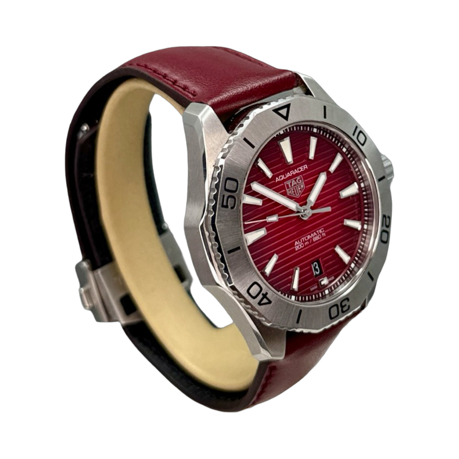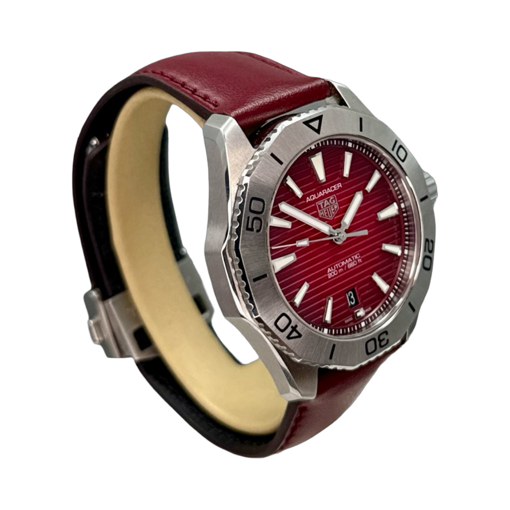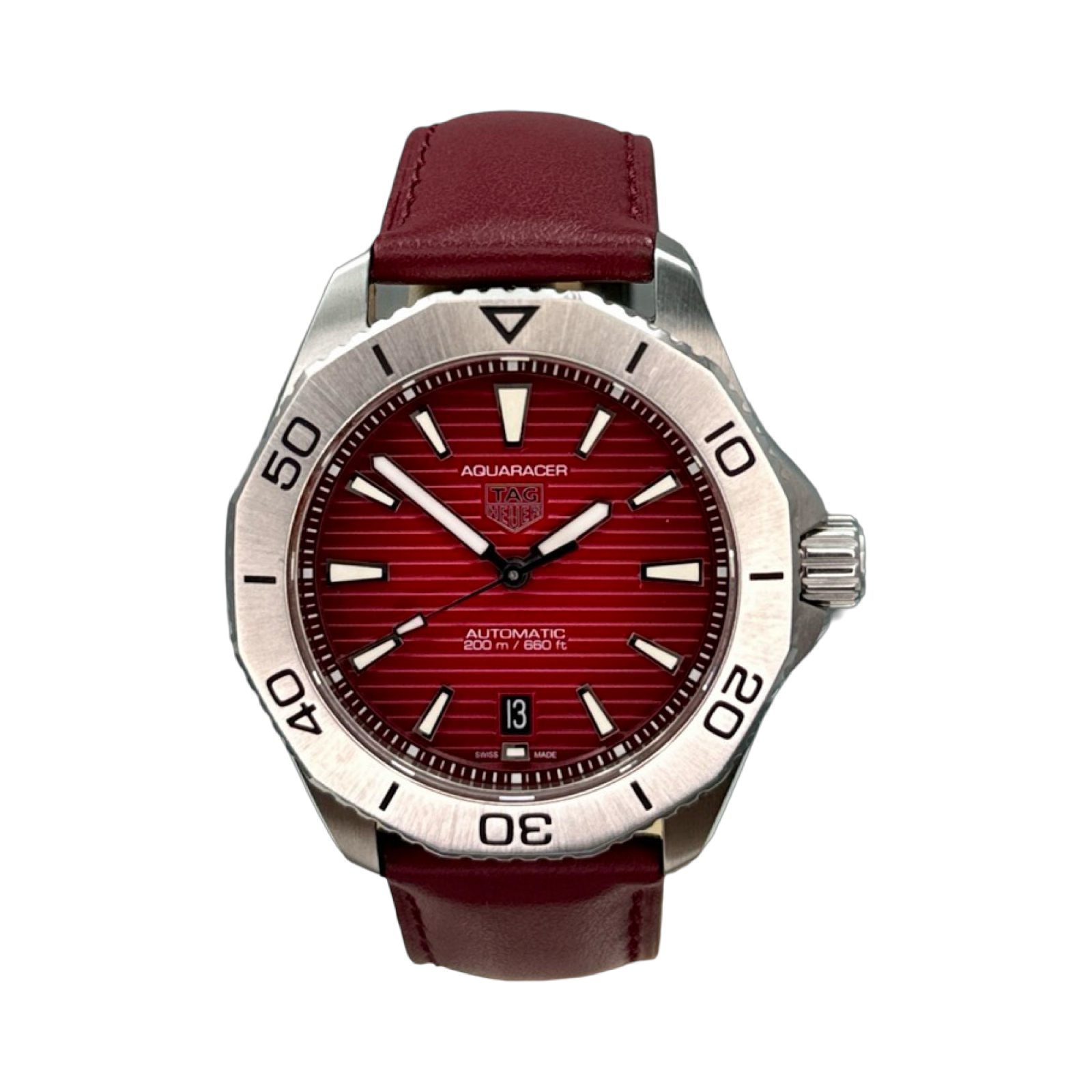 Pre-Owned Tag Heuer Aquaracer watch, features a 43mm stainless steel case with a stainless steel bezel surrounding a reddial on a red leather strap with folding buckle. Functions include hours, minutes, seconds, date. This watch comes with the original box and papers